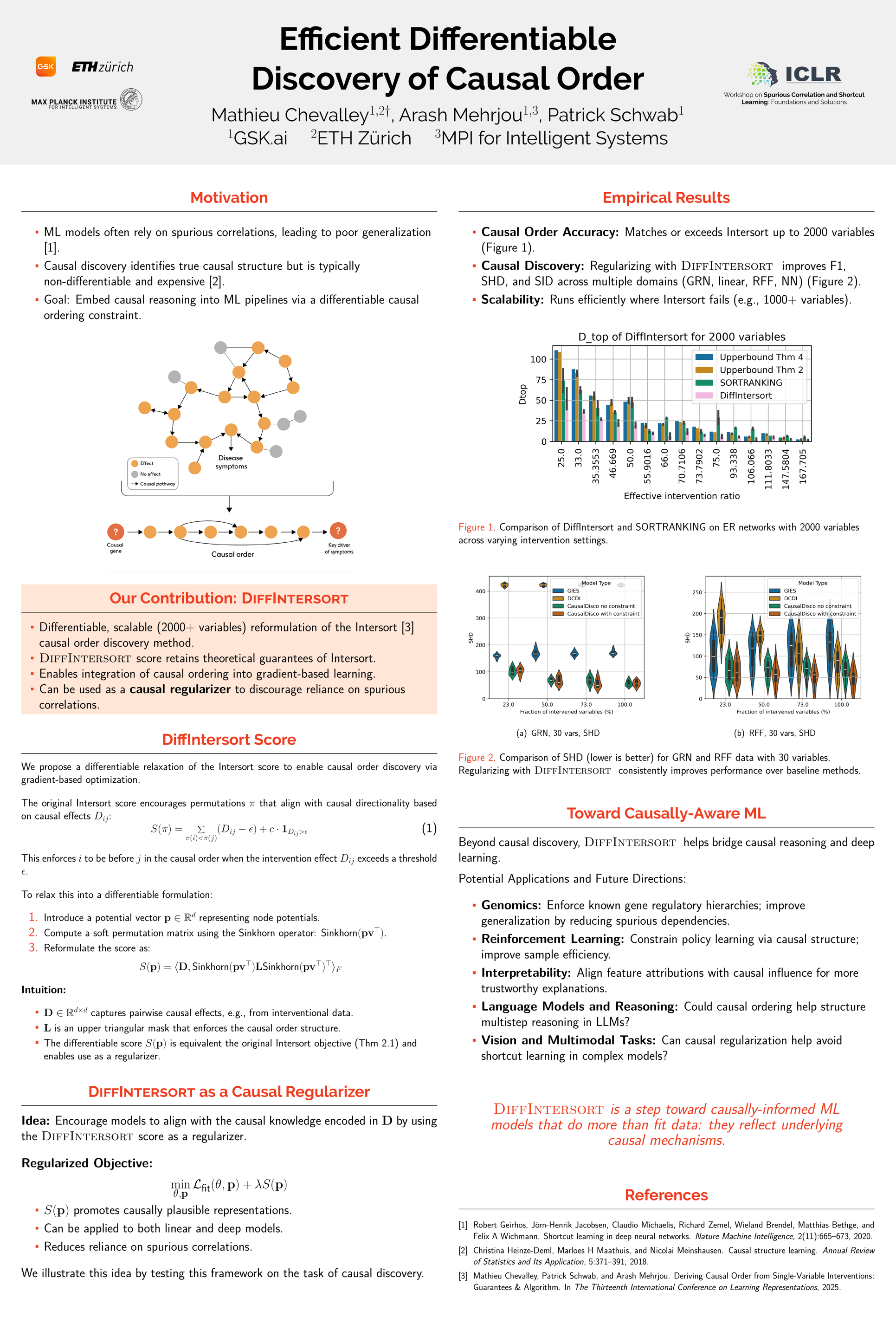 Spurious correlations arise when AI models capture statistical dependencies that do not reflect the true causal structure of the underlying reality, leading to unreliable predictions and unsafe decision-making, particularly in high-stakes domains. While causal discovery methods exist to infer causal structure from data, many are computationally expensive and non-differentiable, limiting their integration into modern AI systems. In this work, we introduce a differentiable approach to causal ordering that allows causal discovery to be seamlessly incorporated as a module within existing machine learning pipelines. Our method builds upon Intersort (Chevalley et al., 2025), a score-based algorithm for discovering causal order in Directed Acyclic Graphs (DAGs) using interventional data. To enable differentiable optimization, we develop a continuous relaxation of Intersort using differentiable sorting and ranking techniques, allowing causal constraints to be directly integrated into gradient-based learning frameworks. By incorporating causal discovery as a regularizer, our approach encourages models to rely on causal relationships rather than spurious correlations, ultimately improving their robustness and trustworthiness when actions are taken based on the learned model. Empirical results demonstrate that enforcing causal order as an inductive bias enhances model generalization and interpretability, making AI systems more reliable and safer for real-world deployment.