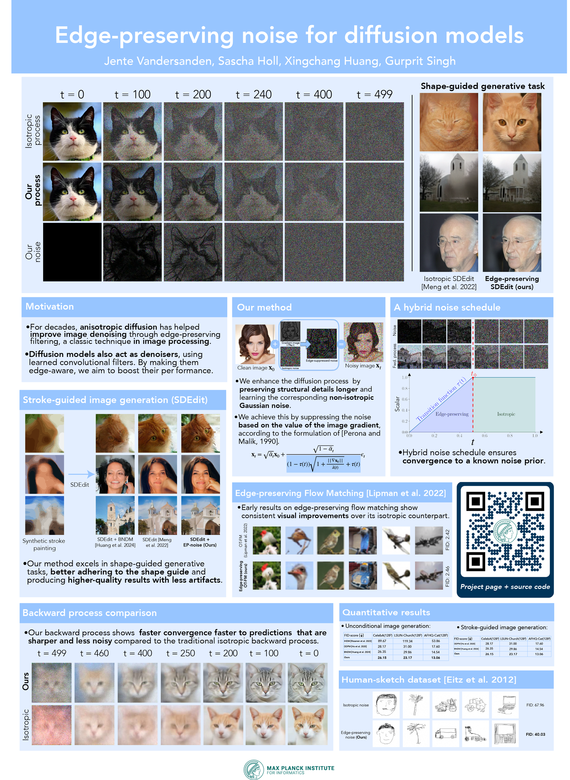 Classical generative diffusion models learn an isotropic Gaussian denoising process, treating all spatial regions uniformly, thus neglecting potentially valuable structural information in the data. Inspired by the long-established work on anisotropic diffusion in image processing, we present a novel edge-preserving diffusion model that generalizes over existing isotropic models by considering a hybrid noise scheme. In particular, we introduce an edge-aware noise scheduler that varies between edge-preserving and isotropic Gaussian noise. We show that our model’s generative process converges faster to results that more closely match the target distribution. We demonstrate its capability to better learn the low-to-mid frequencies within the dataset, which plays a crucial role in representing shapes and structural information. Our edge-preserving diffusion process consistently outperforms state-of-the-art baselines in unconditional image generation. It is also particularly more robust for generative tasks guided by a shape-based prior, such as stroke-to-image generation. We present qualitative and quantitative results (FID and CLIP score) showing consistent improvements of up to 30% for both tasks.