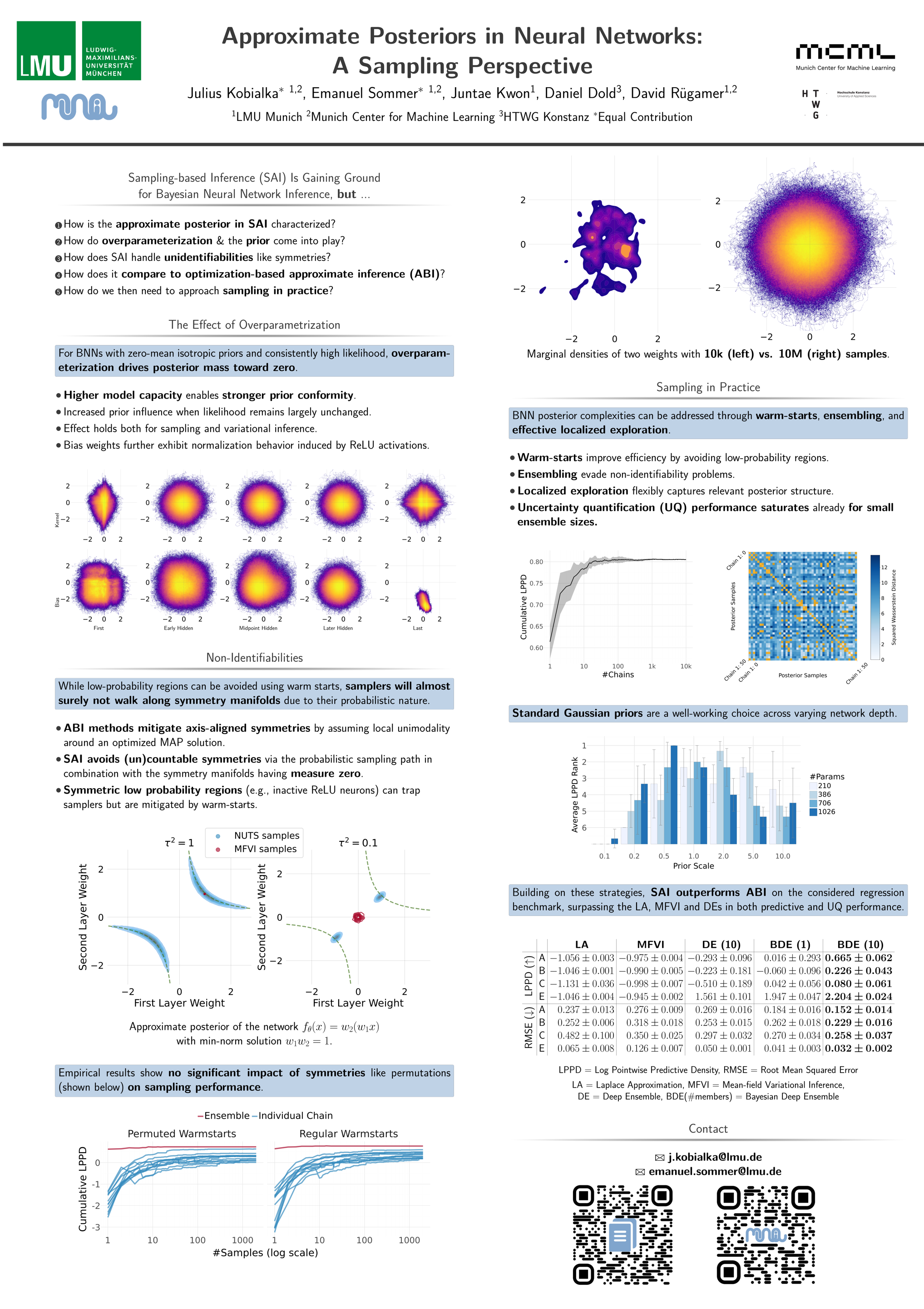The landscape of neural network loss functions is known to be highly complex, and the ability of gradient-based approaches to find well-generalizing solutions to such high-dimensional problems is often considered a miracle. Similarly, Bayesian neural networks (BNNs) inherit this complexity through the model's likelihood. In applications where BNNs are used to account for weight uncertainty, recent advantages in sampling-based inference (SAI) have shown promising results outperforming other approximate Bayesian inference (ABI) methods. In this work, we analyze the approximate posterior implicitly defined by SAI and uncover key insights into its success. Among other things, we demonstrate how SAI handles symmetries differently than ABI, and examine the role of overparameterization. Further, we investigate the characteristics of approximate posteriors with sampling budgets scaled far beyond previously studied limits and explain why the localized behavior of samplers does not inherently constitute a disadvantage.