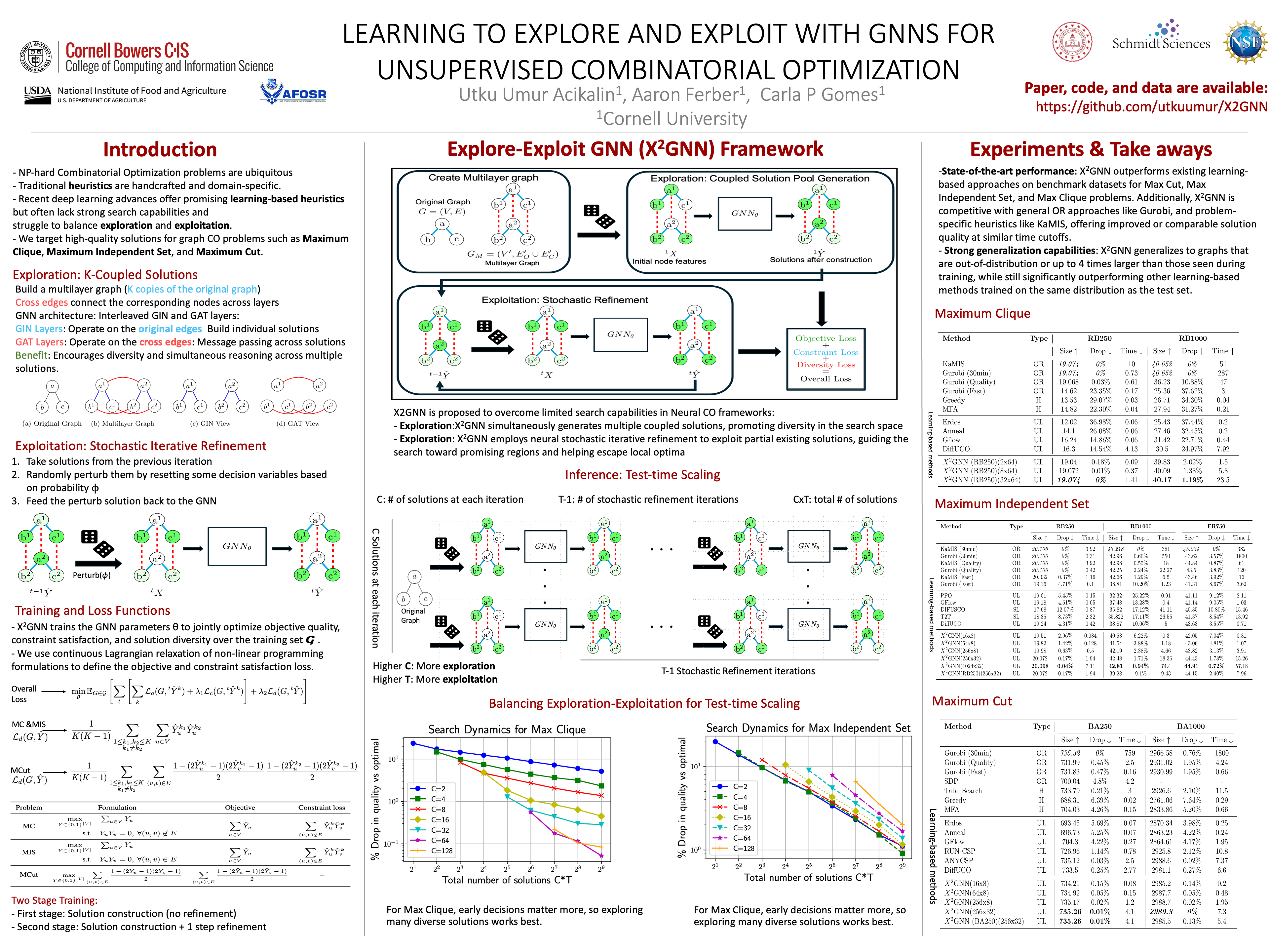 Combinatorial optimization (CO) problems are pervasiveacross various domains, but their NP-hard nature often necessitates problem-specificheuristic algorithms. Recent advancements in deep learning have led to the development of learning-based heuristics, yet these approaches often struggle with limited search capabilities.We introduce Explore-and-Exploit GNN ($X^2$GNN, pronounced x-squared GNN), a novel unsupervised neural framework that combines exploration and exploitation for combinatorial search optimization:i) Exploration - $X^2$GNN generates multiple solutions simultaneously, promoting diversity in the search space; (ii) Exploitation - $X^2$GNN employs neural stochastic iterative refinement to exploit partial existing solutions, guiding the search toward promising regions and helping escape local optima.By balancing exploration and exploitation, $X^2$GNN achieves superior performance and generalization on several graph CO problems including Max Cut, Max Independent Set, and Max Clique. Notably, for large Max Clique problems, $X^2$GNN consistently generates solutions within 1.2\% of optimality, while other state-of-the-art learning-based approaches struggle to reach within 22\% of optimal. Moreover, $X^2$GNN consistently generates better solutions than Gurobi on large graphs for all three problems under reasonable time budgets. Furthermore, $X^2$GNN exhibits exceptional generalization capabilities. For the Maximum Independent Set problem, $X^2$GNN outperforms state-of-the-art methods even when trained on smaller or out-of-distribution graphs compared to the test set. Our framework offers a more effective and flexible approach to neural combinatorial optimization, addressing a key challenge in the field and providing a promising direction for future research in learning-based heuristics for combinatorial optimization.