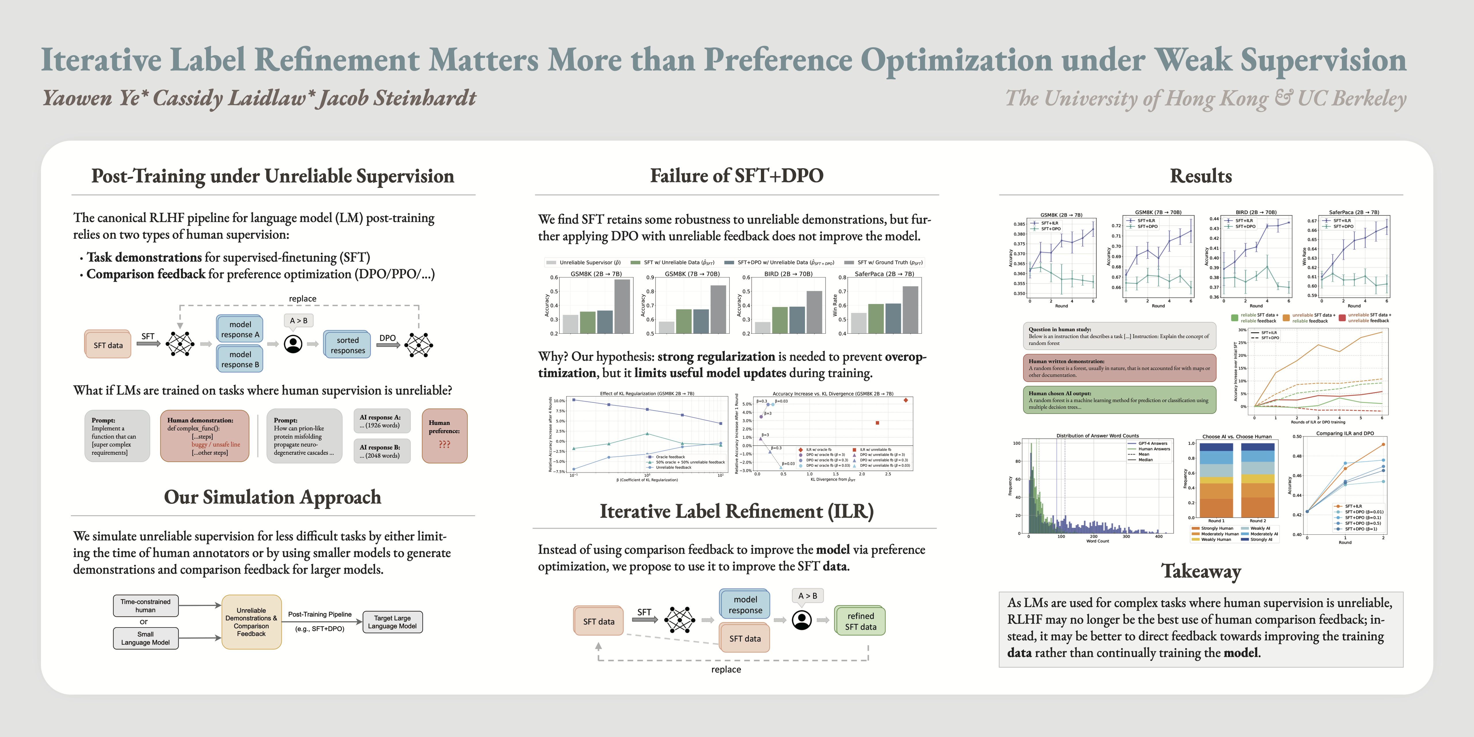 Language model (LM) post-training relies on two stages of human supervision: task demonstrations for supervised finetuning (SFT), followed by preference comparisons for reinforcement learning from human feedback (RLHF). As LMs become more capable, the tasks they are given become harder to supervise. Will post-training remain effective under unreliable supervision? To test this, we simulate unreliable demonstrations and comparison feedback using small LMs and time-constrained humans. We find that in the presence of unreliable supervision, SFT still retains some effectiveness, but DPO (a common RLHF algorithm) fails to improve the model beyond SFT. To address this, we propose iterative label refinement (ILR) as an alternative to RLHF. ILR improves the SFT data by using comparison feedback to decide whether human demonstrations should be replaced by model-generated alternatives, then retrains the model via SFT on the updated data. SFT+ILR outperforms SFT+DPO on several tasks with unreliable supervision (math, coding, and safe instruction-following). Our findings suggest that as LMs are used for complex tasks where human supervision is unreliable, RLHF may no longer be the best use of human comparison feedback; instead, it is better to direct feedback towards improving the training data rather than continually training the model. Our code and data are available at https://github.com/helloelwin/iterative-label-refinement.