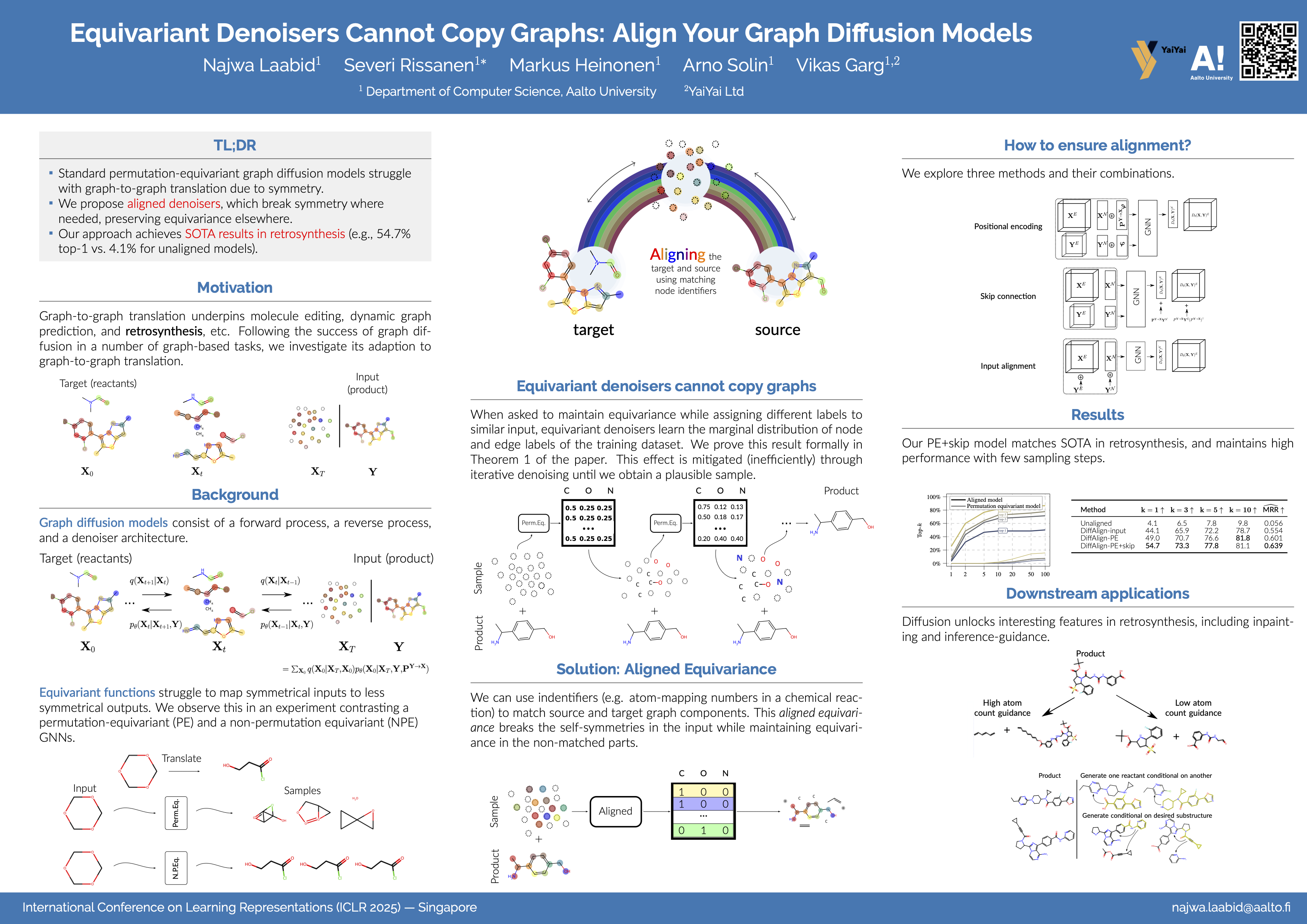 Graph diffusion models, dominant in graph generative modeling, remain underexplored for graph-to-graph translation tasks like chemical reaction prediction. We demonstrate that standard permutation equivariant denoisers face fundamental limitations in these tasks due to their inability to break symmetries in noisy inputs. To address this, we propose \emph{aligning} input and target graphs to break input symmetries while preserving permutation equivariance in non-matching graph portions. Using retrosynthesis (i.e., the task of predicting precursors for synthesis of a given target molecule) as our application domain, we show how alignment dramatically improves discrete diffusion model performance from $5$\% to a SOTA-matching $54.7$\% top-1 accuracy. Code is available at https://github.com/Aalto-QuML/DiffAlign.