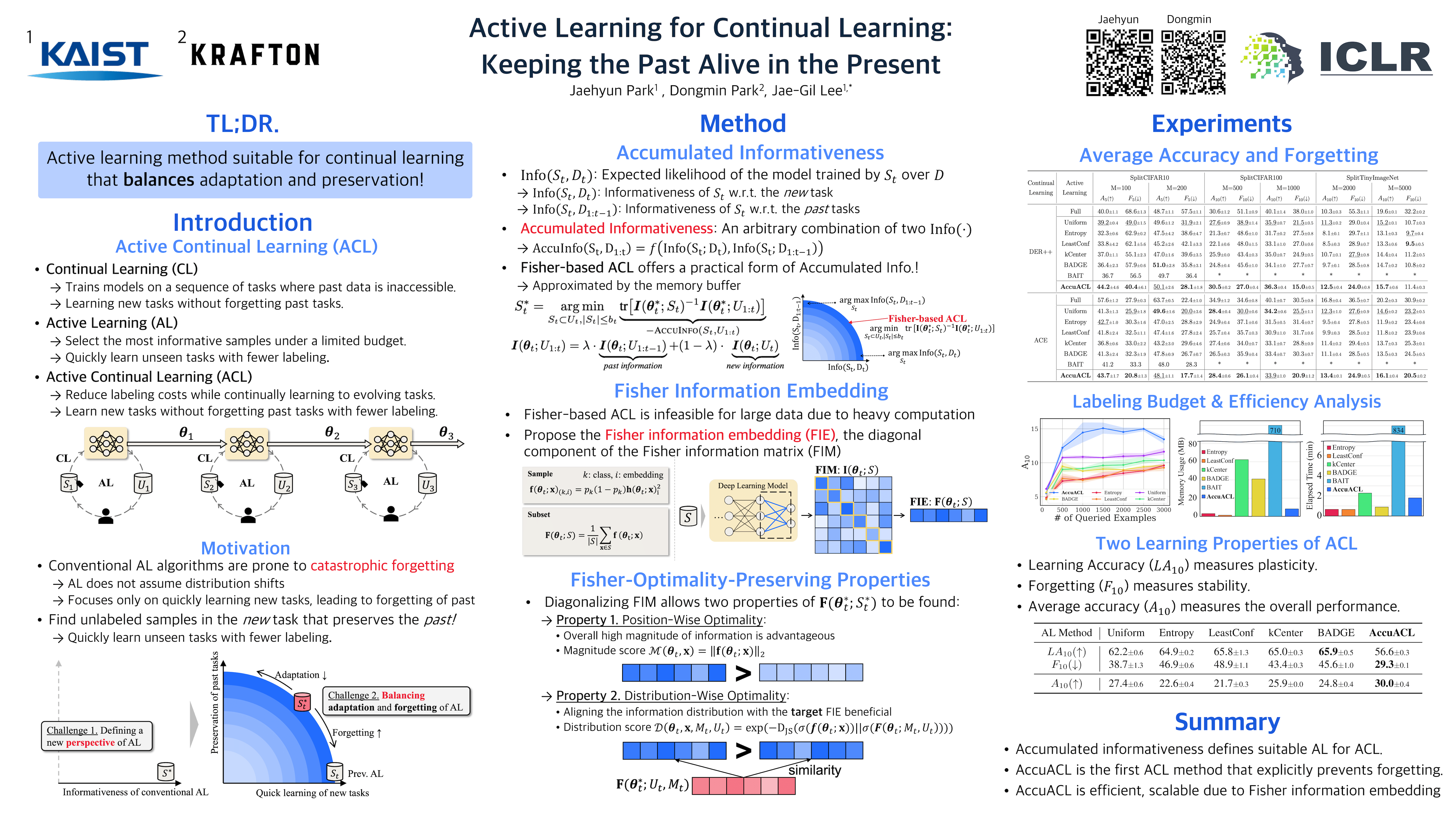 Continual learning (CL) enables deep neural networks to adapt to ever-changing data distributions. In practice, there may be scenarios where annotation is costly, leading to active continual learning (ACL), which performs active learning (AL) for the CL scenarios when reducing the labeling cost by selecting the most informative subset is preferable. However, conventional AL strategies are not suitable for ACL, as they focus solely on learning the new knowledge, leading to catastrophic forgetting of previously learned tasks. Therefore, ACL requires a new AL strategy that can balance the prevention of catastrophic forgetting and the ability to quickly learn new tasks. In this paper, we propose AccuACL, Accumulated informativeness-based Active Continual Learning, by the novel use of the Fisher information matrix as a criterion for sample selection, derived from a theoretical analysis of the Fisher-optimality preservation properties within the framework of ACL, while also addressing the scalability issue of Fisher information-based AL. Extensive experiments demonstrate that AccuACL significantly outperforms AL baselines across various CL algorithms, increasing the average accuracy and forgetting by 23.8% and 17.0%, respectively, on average.