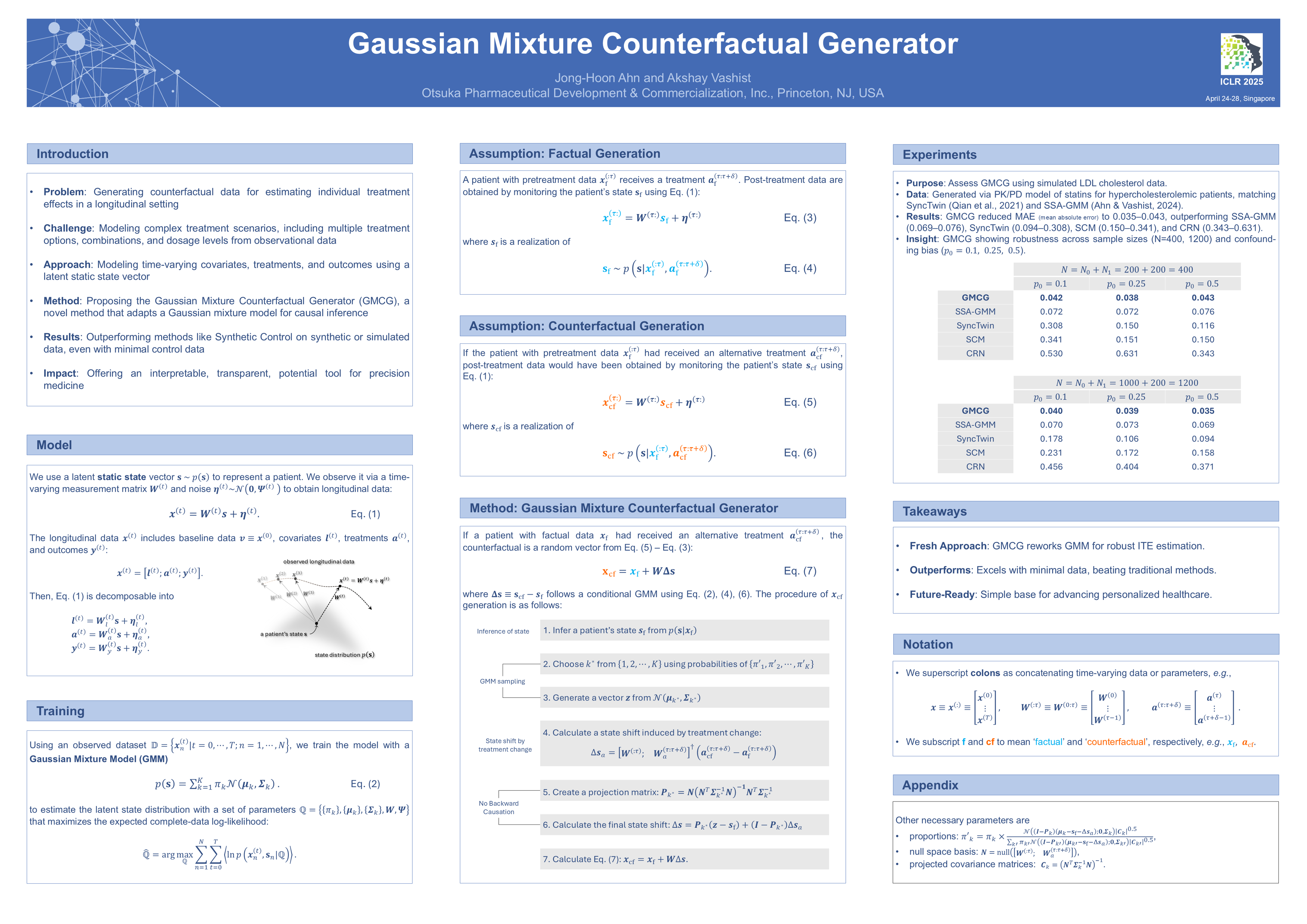 We address the individualized treatment effect (ITE) estimation problem, focusing on continuous, multidimensional, and time-dependent treatments for precision medicine. The central challenge lies in modeling these complex treatment scenarios while capturing dynamic patient responses and minimizing reliance on control data. We propose the Gaussian Mixture Counterfactual Generator (GMCG), a generative model that transforms the Gaussian mixture model—traditionally a tool for clustering and density estimation—into a new tool explicitly geared toward causal inference. This approach generates robust counterfactuals by effectively handling continuous and multidimensional treatment spaces. We evaluate GMCG on synthetic crossover trial data and simulated datasets, demonstrating its superior performance over existing methods, particularly in scenarios with limited control data. GMCG derives its effectiveness from modeling the joint distribution of covariates, treatments, and outcomes using a latent state vector while employing a conditional distribution of the state vector to suppress confounding and isolate treatment-outcome relationships.