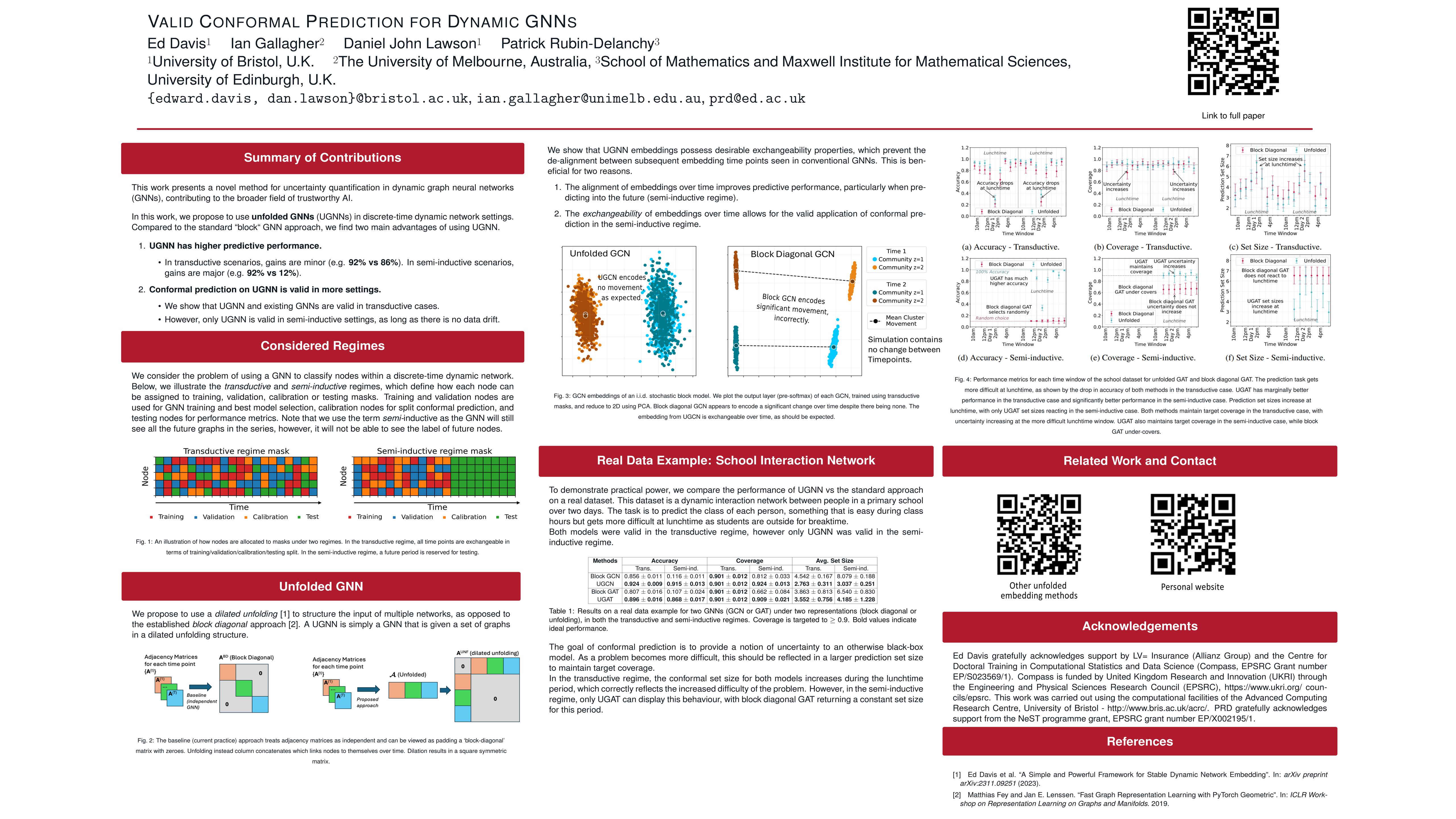Dynamic graphs provide a flexible data abstraction for modelling many sorts of real-world systems, such as transport, trade, and social networks. Graph neural networks (GNNs) are powerful tools allowing for different kinds of prediction and inference on these systems, but getting a handle on uncertainty, especially in dynamic settings, is a challenging problem.In this work we propose to use a dynamic graph representation known in the tensor literature as the unfolding, to achieve valid prediction sets via conformal prediction. This representation, a simple graph, can be input to any standard GNN and does not require any modification to existing GNN architectures or conformal prediction routines. One of our key contributions is a careful mathematical consideration of the different inference scenarios which can arise in a dynamic graph modelling context. For a range of practically relevant cases, we obtain valid prediction sets with almost no assumptions, even dispensing with exchangeability. In a more challenging scenario, which we call the semi-inductive regime, we achieve valid prediction under stronger assumptions, akin to stationarity. We provide real data examples demonstrating validity, showing improved accuracy over baselines, and sign-posting different failure modes which can occur when those assumptions are violated.