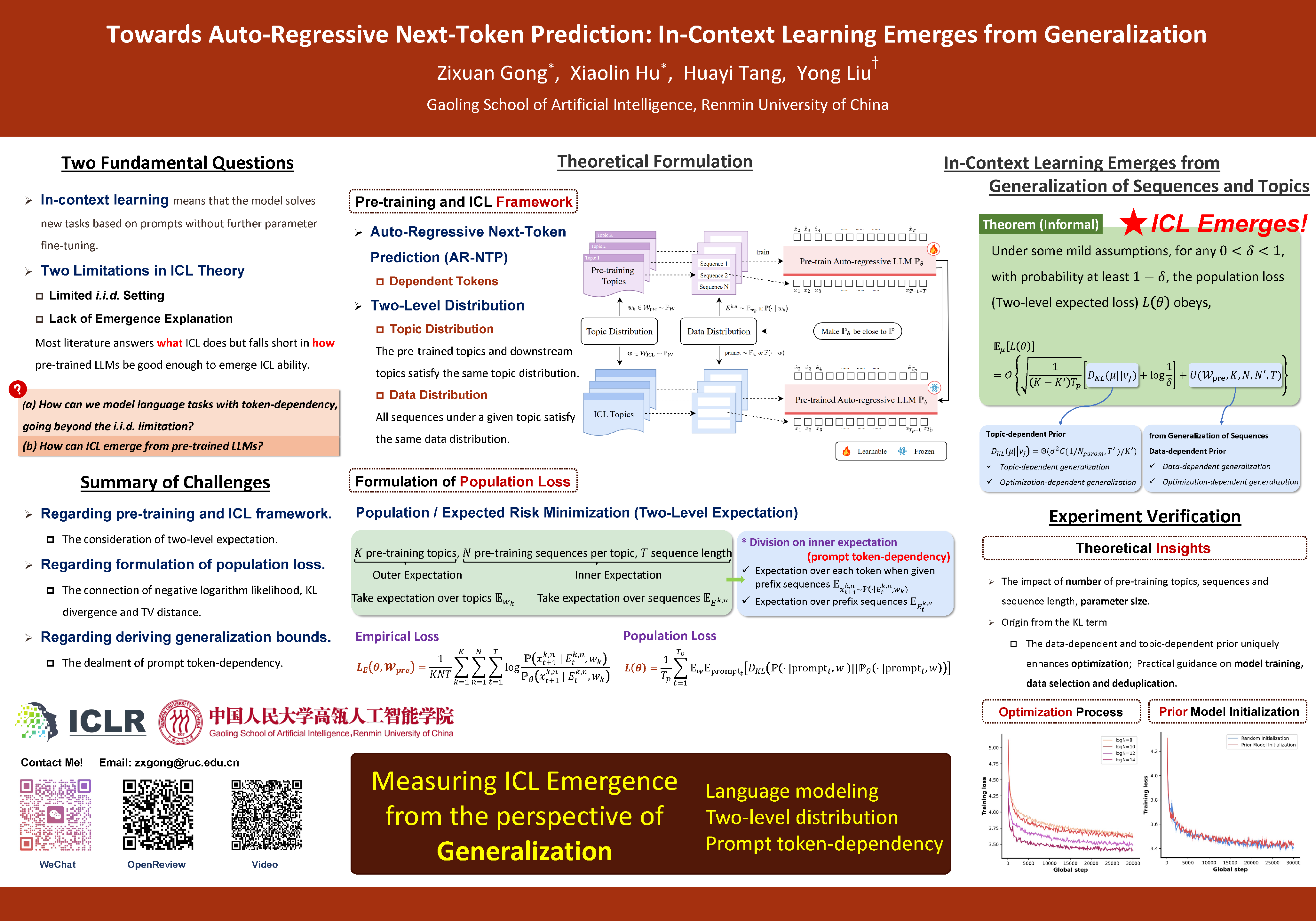Large language models (LLMs) have demonstrated remarkable in-context learning (ICL) abilities. However, existing theoretical analysis of ICL primarily exhibits two limitations: \textbf{(a) Limited \textit{i.i.d.} Setting.} Most studies focus on supervised function learning tasks where prompts are constructed with \textit{i.i.d.} input-label pairs. This \textit{i.i.d.} assumption diverges significantly from real language learning scenarios where prompt tokens are interdependent. \textbf{(b) Lack of Emergence Explanation.} Most literature answers \textbf{\textit{what}} ICL does from an implicit optimization perspective but falls short in elucidating \textbf{\textit{how}} ICL emerges and the impact of pre-training phase on ICL. In our paper, to extend (a), we adopt a more practical paradigm, \textbf{\textit{auto-regressive next-token prediction (AR-NTP)}}, which closely aligns with the actual training of language models. Specifically, within AR-NTP, we emphasize prompt token-dependency, which involves predicting each subsequent token based on the preceding sequence. To address (b), we formalize a systematic pre-training and ICL framework, highlighting the layer-wise structure of sequences and topics, alongside a two-level expectation. In conclusion, we present data-dependent, topic-dependent and optimization-dependent PAC-Bayesian generalization bounds for pre-trained LLMs, investigating that \textbf{\textit{ICL emerges from the generalization of sequences and topics}}. Our theory is supported by experiments on numerical linear dynamic systems, synthetic GINC and real-world language datasets.