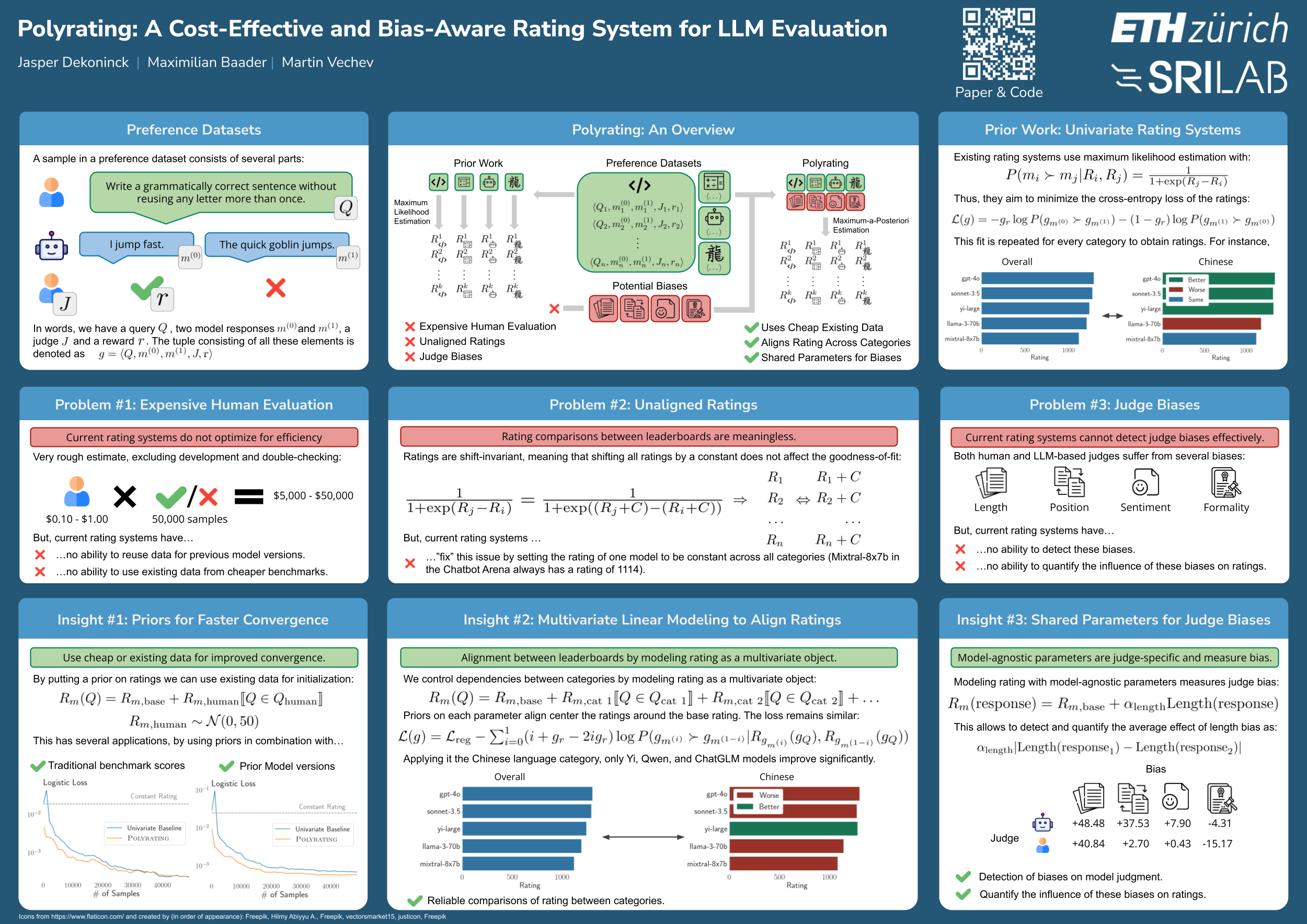 Rating-based human evaluation has become an essential tool to accurately evaluate the impressive performance of large language models (LLMs). However, current rating systems suffer from several important limitations: first, they fail to account for biases that significantly influence evaluation results, second, they require large and expensive preference datasets to obtain accurate ratings, and third, they do not facilitate meaningful comparisons of model ratings across different tasks. To address these issues, we introduce Polyrating, an expressive and flexible rating system based on maximum a posteriori estimation that enables a more nuanced and thorough analysis of model performance at lower costs. Polyrating can detect and quantify biases affecting human preferences, ensuring fairer model comparisons. Further, Polyrating can reduce the cost of human evaluations by up to $41$% for new models and up to $77$% for new tasks by leveraging existing benchmark scores. Lastly, Polyrating enables direct comparisons of ratings across different tasks, providing a comprehensive understanding of an LLMs' strengths, weaknesses, and relative performance across different applications.
