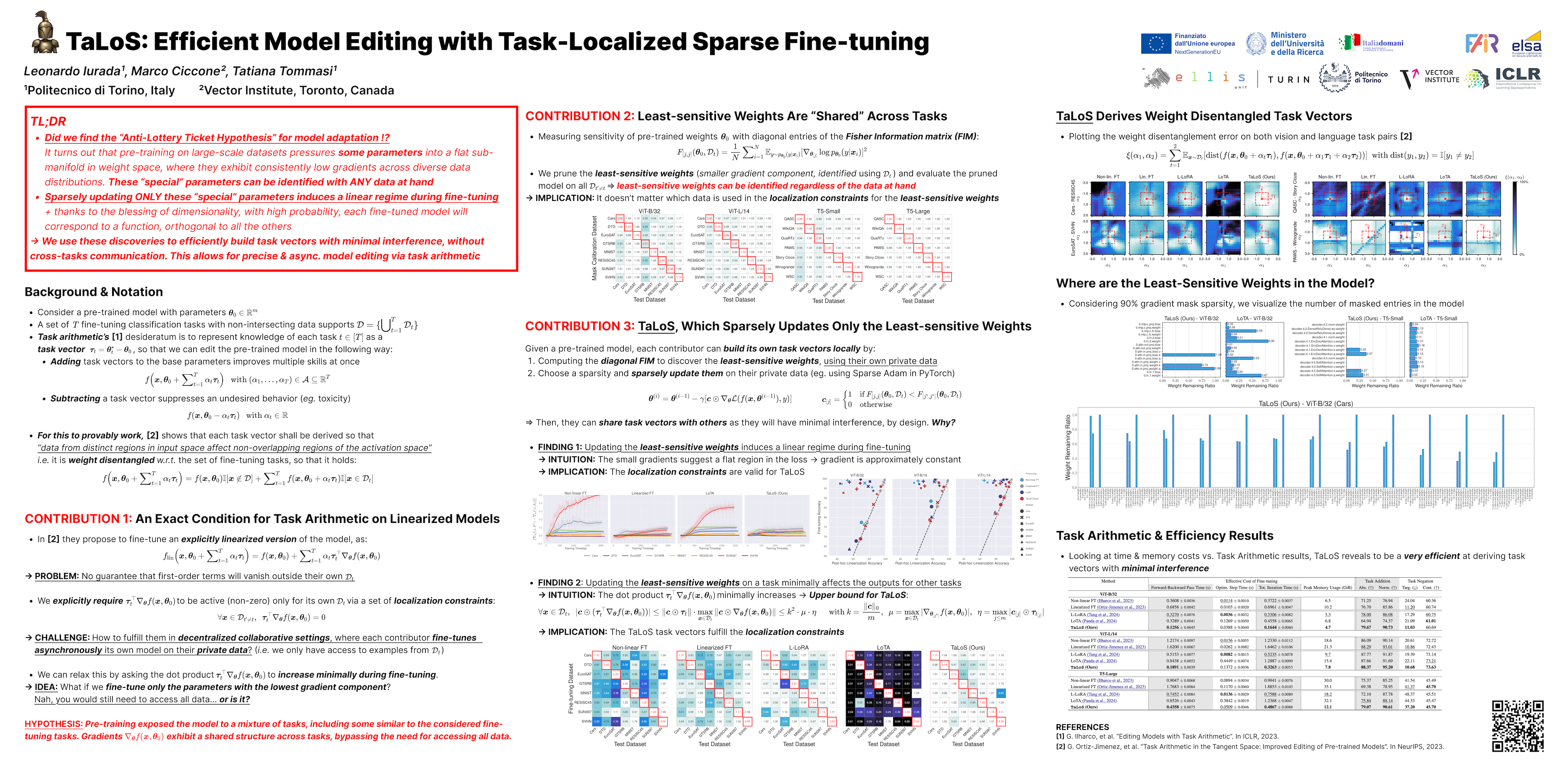 Task arithmetic has emerged as a promising approach for editing models by representing task-specific knowledge as composable task vectors. However, existing methods rely on network linearization to derive task vectors, leading to computational bottlenecks during training and inference. Moreover, linearization alone does not ensure weight disentanglement, the key property that enables conflict-free composition of task vectors. To address this, we propose TaLoS which allows to build sparse task vectors with minimal interference without requiring explicit linearization and sharing information across tasks. We find that pre-trained models contain a subset of parameters with consistently low gradient sensitivity across tasks, and that sparsely updating only these parameters allows for promoting weight disentanglement during fine-tuning. Our experiments prove that TaLoS improves training and inference efficiency while outperforming current methods in task addition and negation. By enabling modular parameter editing, our approach fosters practical deployment of adaptable foundation models in real-world applications.