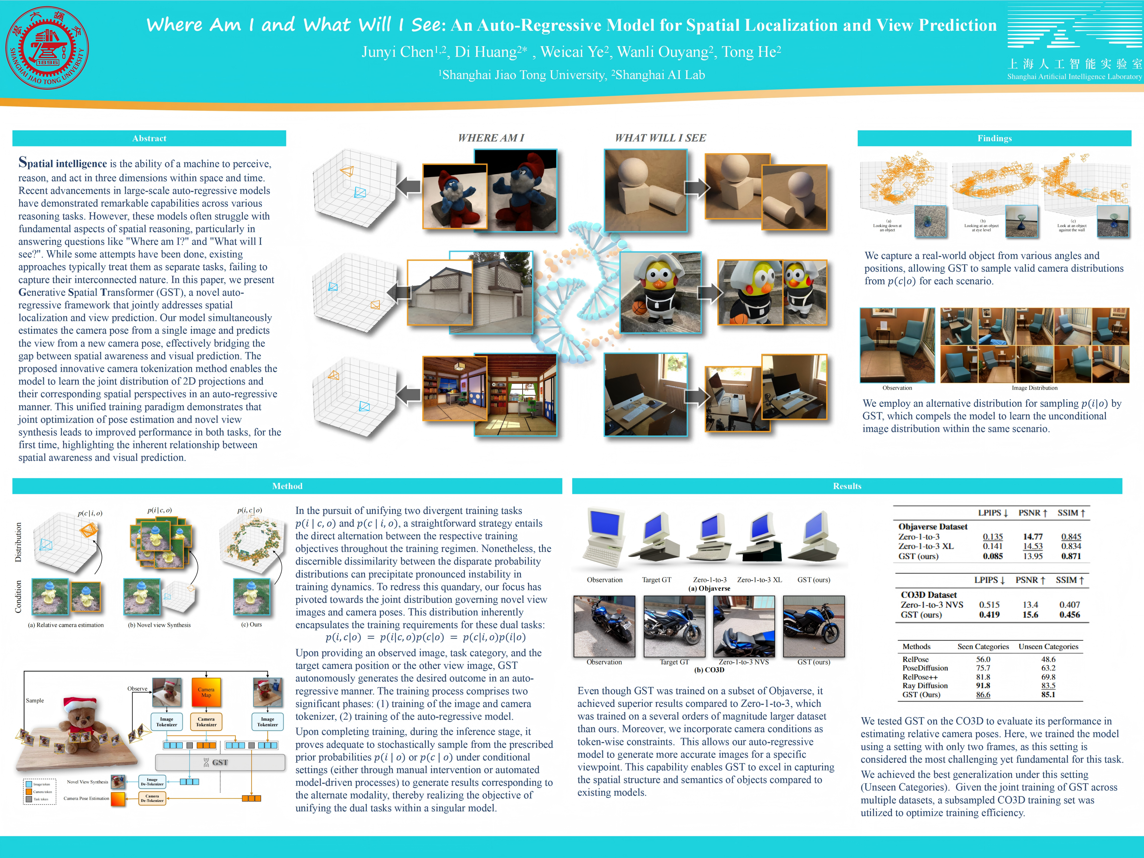 Spatial intelligence is the ability of a machine to perceive, reason, and act in three dimensions within space and time.Recent advancements in large-scale auto-regressive models have demonstrated remarkable capabilities across various reasoning tasks. However, these models often struggle with fundamental aspects of spatial reasoning, particularly in answering questions like "Where am I?" and "What will I see?". While some attempts have been done, existing approaches typically treat them as separate tasks, failing to capture their interconnected nature. In this paper, we present Generative Spatial Transformer (GST), a novel auto-regressive framework that jointly addresses spatial localization and view prediction. Our model simultaneously estimates the camera pose from a single image and predicts the view from a new camera pose, effectively bridging the gap between spatial awareness and visual prediction. The proposed innovative camera tokenization method enables the model to learn the joint distribution of 2D projections and their corresponding spatial perspectives in an auto-regressive manner. This unified training paradigm demonstrates that joint optimization of pose estimation and novel view synthesis leads to improved performance in both tasks, for the first time, highlighting the inherent relationship between spatial awareness and visual prediction.
