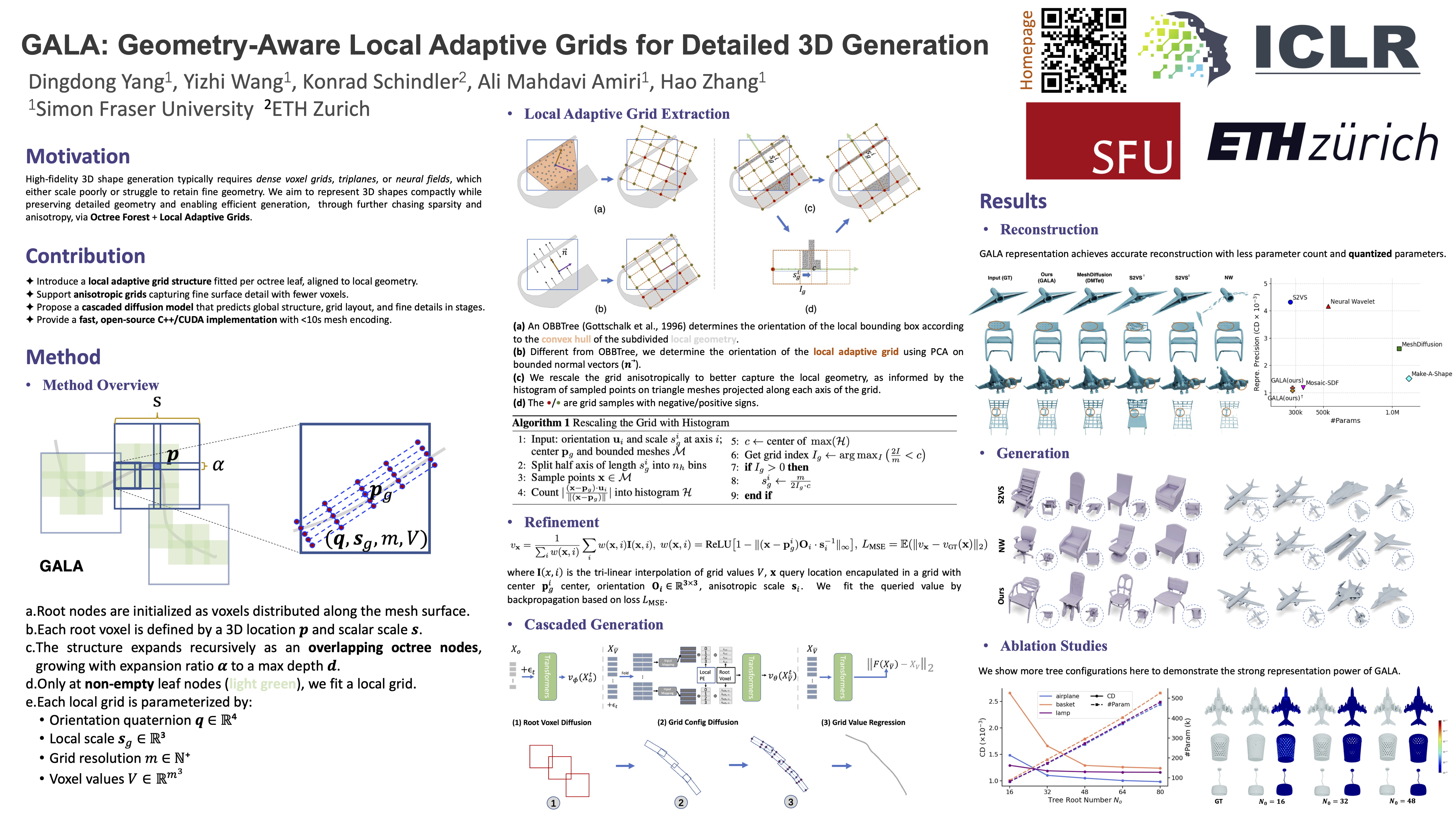 We propose GALA, a novel representation of 3D shapes that (i) excels at capturing and reproducing complex geometry and surface details, (ii) is computationally efficient, and (iii) lends itself to 3D generative modelling with modern, diffusion-based schemes. The key idea of GALA is to exploit both the global sparsity of surfaces within a 3D volume and their local surface properties. Sparsity is promoted by covering only the 3D object boundaries, not empty space, with an ensemble of tree root voxels. Each voxel contains an octree to further limit storage and compute to regions that contain surfaces. Adaptivity is achieved by fitting one local and geometry-aware coordinate frame in each non-empty leaf node. Adjusting the orientation of the local grid, as well as the anisotropic scales of its axes, to the local surface shape greatly increases the amount of detail that can be stored in a given amount of memory, which in turn allows for quantization without loss of quality. With our optimized C++/CUDA implementation, GALA can be fitted to an object in less than 10 seconds. Moreover, the representation can efficiently be flattened and manipulated with transformer networks. We provide a cascaded generation pipeline capable of generating 3D shapes with great geometric detail. For more information, please visit our project page.