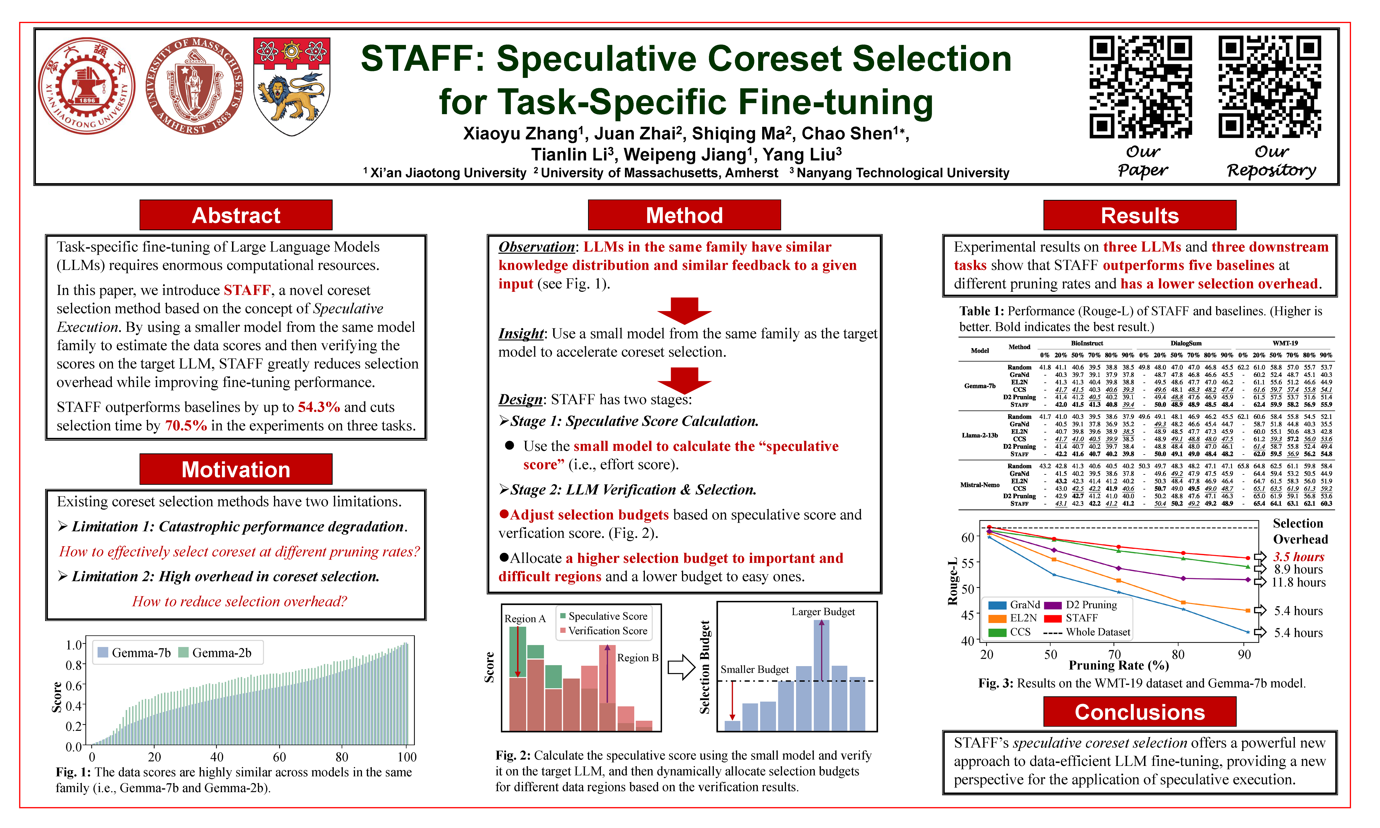Task-specific fine-tuning is essential for the deployment of large language models (LLMs), but it requires significant computational resources and time. Existing solutions have proposed coreset selection methods to improve data efficiency and reduce model training overhead, but they still have limitations: ❶ Overlooking valuable samples at high pruning rates, which degrades the coreset’s performance.❷ Requiring high time overhead during coreset selection to fine-tune and evaluate the target LLM. In this paper, we introduce STAFF, a speculative coreset selection method. STAFF leverages a small model from the same family as the target LLM to efficiently estimate data scores and then verifies the scores on the target LLM to accurately identify and allocate more selection budget to important regions while maintaining coverage of easy regions. We evaluate STAFF on three LLMs and three downstream tasks and show that STAFF improves the performance of SOTA methods by up to 54.3% and reduces selection overhead by up to 70.5% at different pruning rates. Furthermore, we observe that the coreset selected by STAFF at low pruning rates (i.e., 20%) can even obtain better fine-tuning performance than the full dataset.