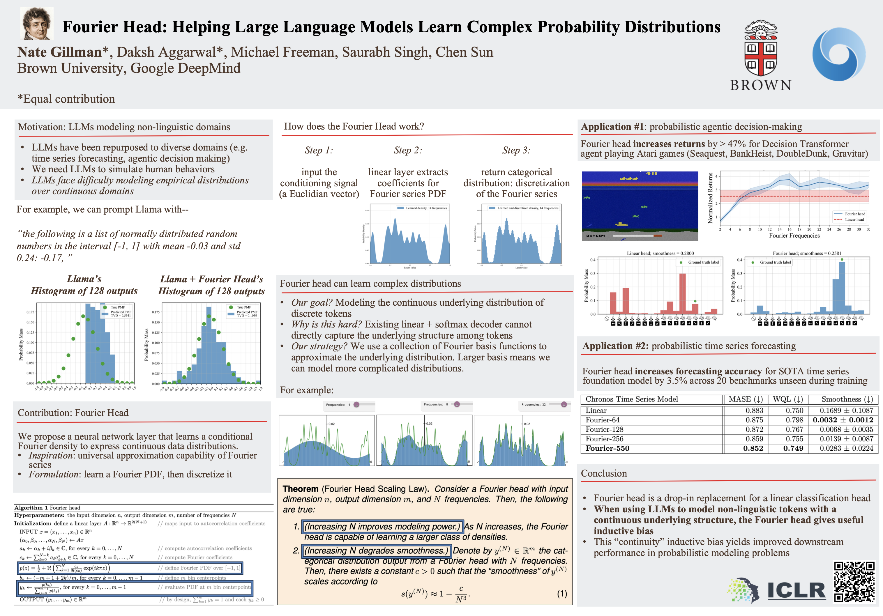 As the quality of large language models has improved, there has been increased interest in using them to model non-linguistic tokens. For example, the Decision Transformer recasts agentic decision making as a sequence modeling problem, using a decoder-only LLM to model the distribution over the discrete action space for an Atari agent. However, when adapting LLMs to non-linguistic domains, it remains unclear if softmax over discrete bins captures the continuous structure of the tokens and the potentially complex distributions needed for high quality token generation. We introduce a neural network layer, constructed using Fourier series, which we can easily substitute for any linear layer if we want the outputs to have a more continuous structure. We perform extensive analysis on synthetic datasets, as well as on large-scale decision making and time series forecasting tasks. We also provide theoretical evidence that this layer can better learn signal from data while ignoring high-frequency noise. All of our results support the effectiveness of our proposed Fourier head in scenarios where the underlying data distribution has a natural continuous structure. For example, the Fourier head improves a Decision Transformer agent's returns across four benchmark Atari games by as much as 377\%, and increases a state-of-the-art times series foundation model's forecasting performance by 3.5\% across 20 benchmarks unseen during training.We release our implementation at https://nategillman.com/fourier-head
