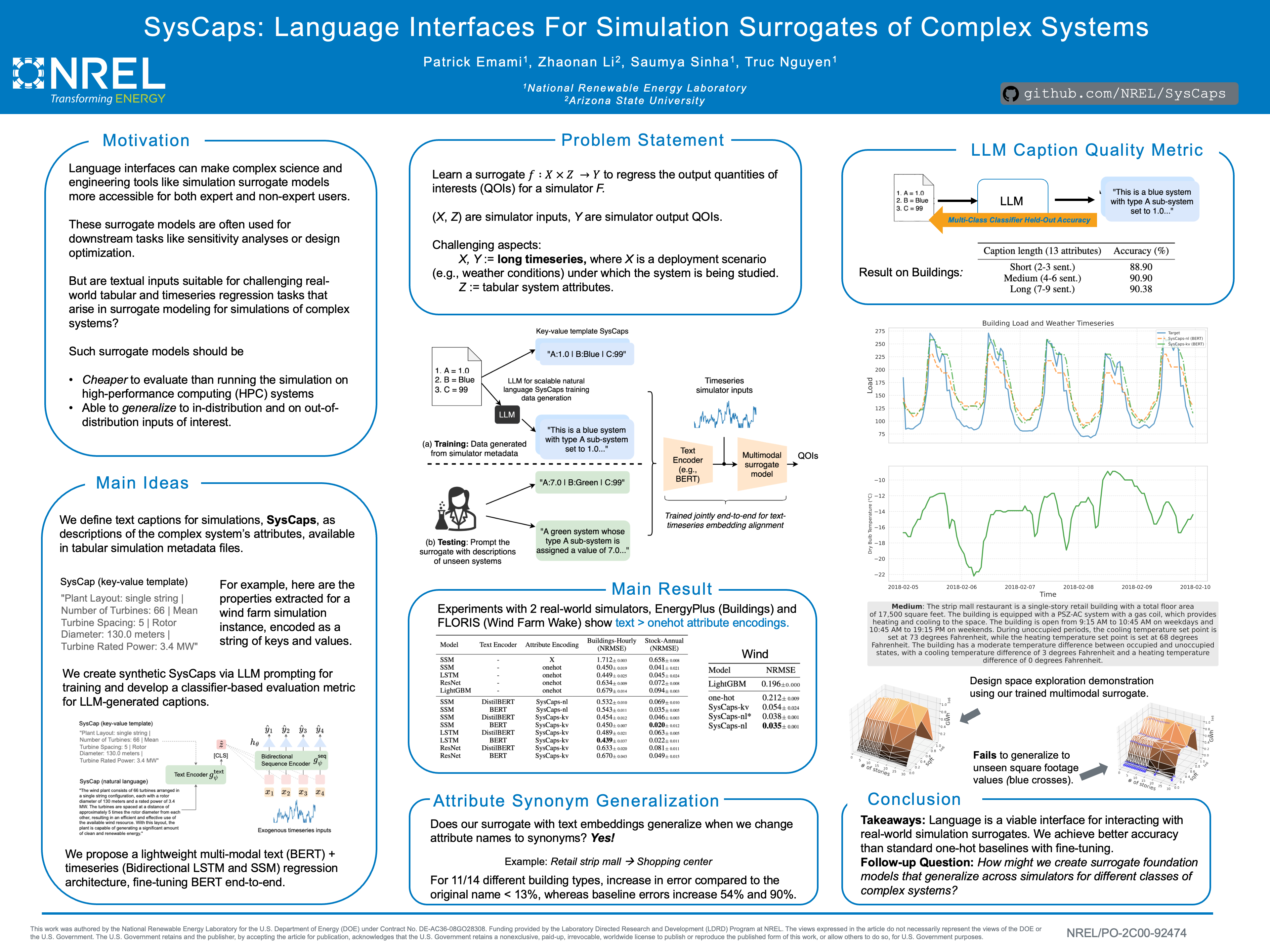 Surrogate models are used to predict the behavior of complex energy systems that are too expensive to simulate with traditional numerical methods. Our work introduces the use of language descriptions, which we call "system captions" or SysCaps, to interface with such surrogates. We argue that interacting with surrogates through text, particularly natural language, makes these models more accessible for both experts and non-experts.We introduce a lightweight multimodal text and timeseries regression model and a training pipeline that uses large language models (LLMs) to synthesize high-quality captions from simulation metadata. Our experiments on two real-world simulators of buildings and wind farms show that our SysCaps-augmented surrogates have better accuracy on held-out systems than traditional methods while enjoying new generalization abilities, such as handling semantically related descriptions of the same test system.Additional experiments also highlight the potential of SysCaps to unlock language-driven design space exploration and to regularize training through prompt augmentation.