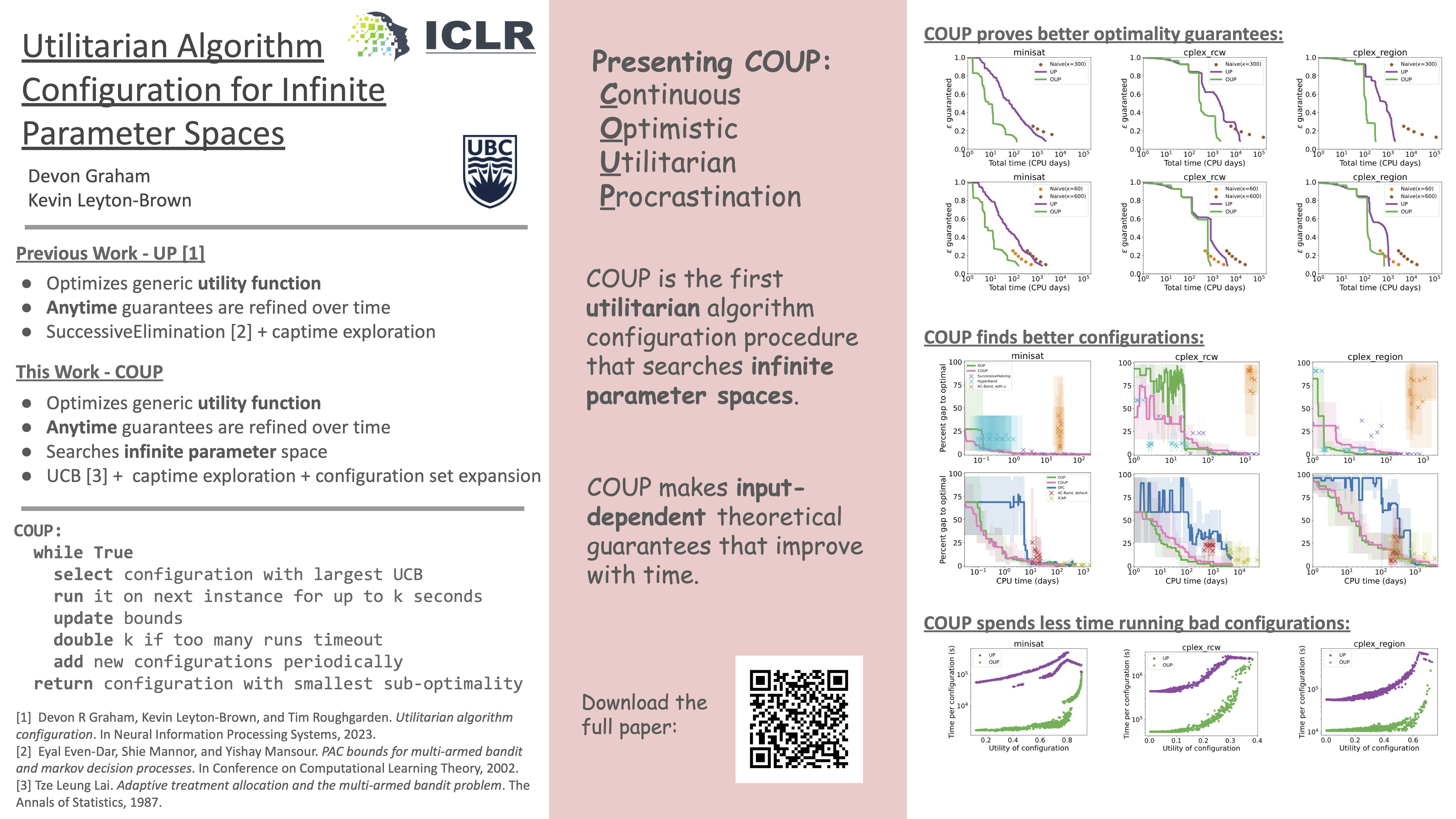 Utilitarian algorithm configuration is a general-purpose technique for automatically searching the parameter space of a given algorithm to optimize its performance, as measured by a given utility function, on a given set of inputs. Recently introduced utilitarian configuration procedures offer optimality guarantees about the returned parameterization while provably adapting to the hardness of the underlying problem. However, the applicability of these approaches is severely limited by the fact that they only search a finite, relatively small set of parameters. They cannot effectively search the configuration space of algorithms with continuous or uncountable parameters. In this paper we introduce a new procedure, which we dub COUP (Continuous, Optimistic Utilitarian Procrastination). COUP is designed to search infinite parameter spaces efficiently to find good configurations quickly. Furthermore, COUP maintains the theoretical benefits of previous utilitarian configuration procedures when applied to finite parameter spaces but is significantly faster, both provably and experimentally.