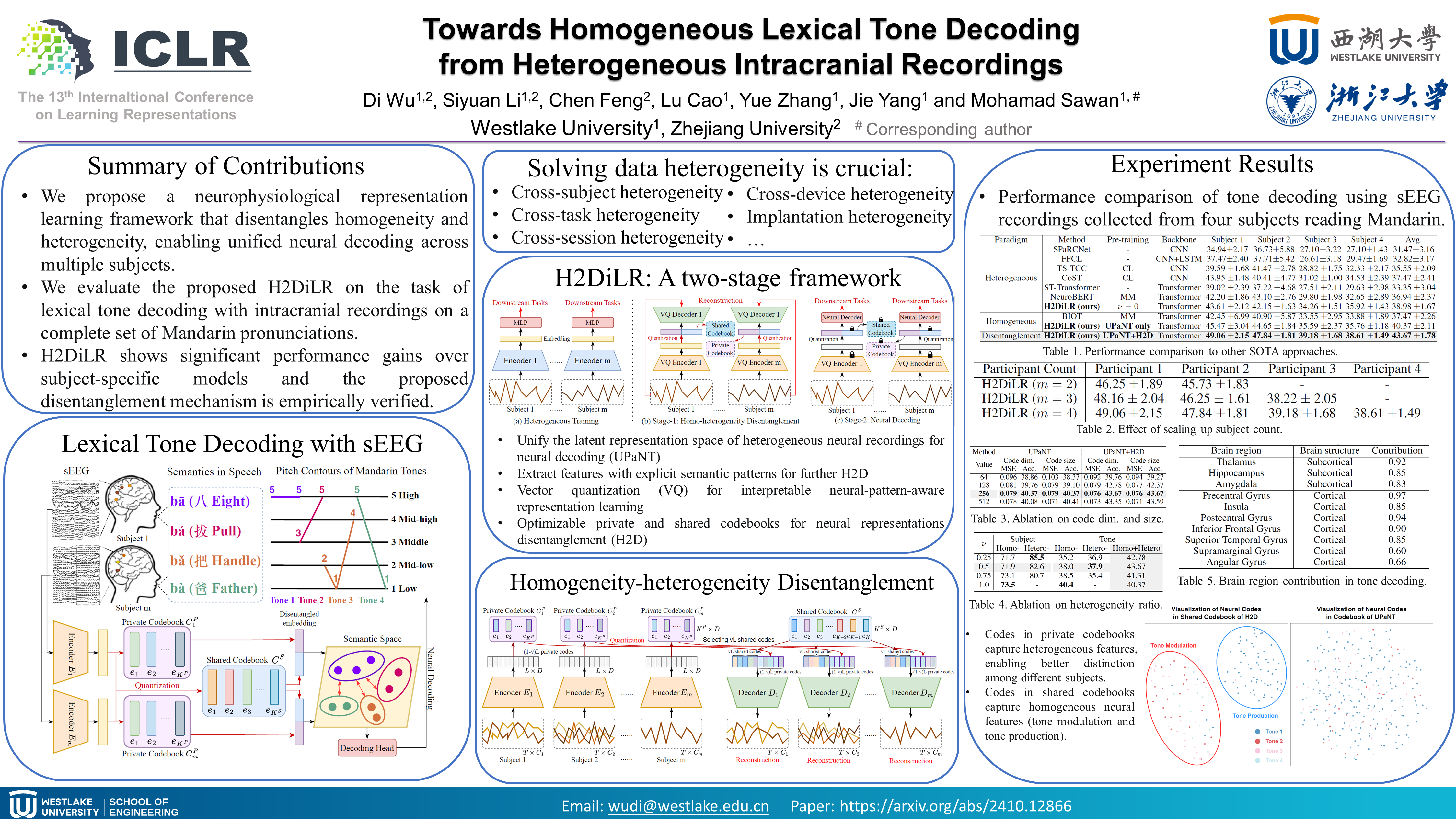 Recent advancements in brain-computer interfaces (BCIs) and deep learning have made decoding lexical tones from intracranial recordings possible, providing the potential to restore the communication ability of speech-impaired tonal language speakers. However, data heterogeneity induced by both physiological and instrumental factors poses a significant challenge for unified invasive brain tone decoding. Particularly, the existing heterogeneous decoding paradigm (training subject-specific models with individual data) suffers from the intrinsic limitation that fails to learn generalized neural representations and leverages data across subjects. To this end, we introduce Homogeneity-Heterogeneity Disentangled Learning for Neural Representations (H2DiLR), a framework that disentangles and learns the homogeneity and heterogeneity from intracranial recordings of multiple subjects. To verify the effectiveness of H2DiLR, we collected stereoelectroencephalography (sEEG) from multiple participants reading Mandarin materials containing 407 syllables (covering nearly all Mandarin characters). Extensive experiments demonstrate that H2DiLR, as a unified decoding paradigm, outperforms the naive heterogeneous decoding paradigm by a large margin. We also empirically show that H2DiLR indeed captures homogeneity and heterogeneity during neural representation learning.