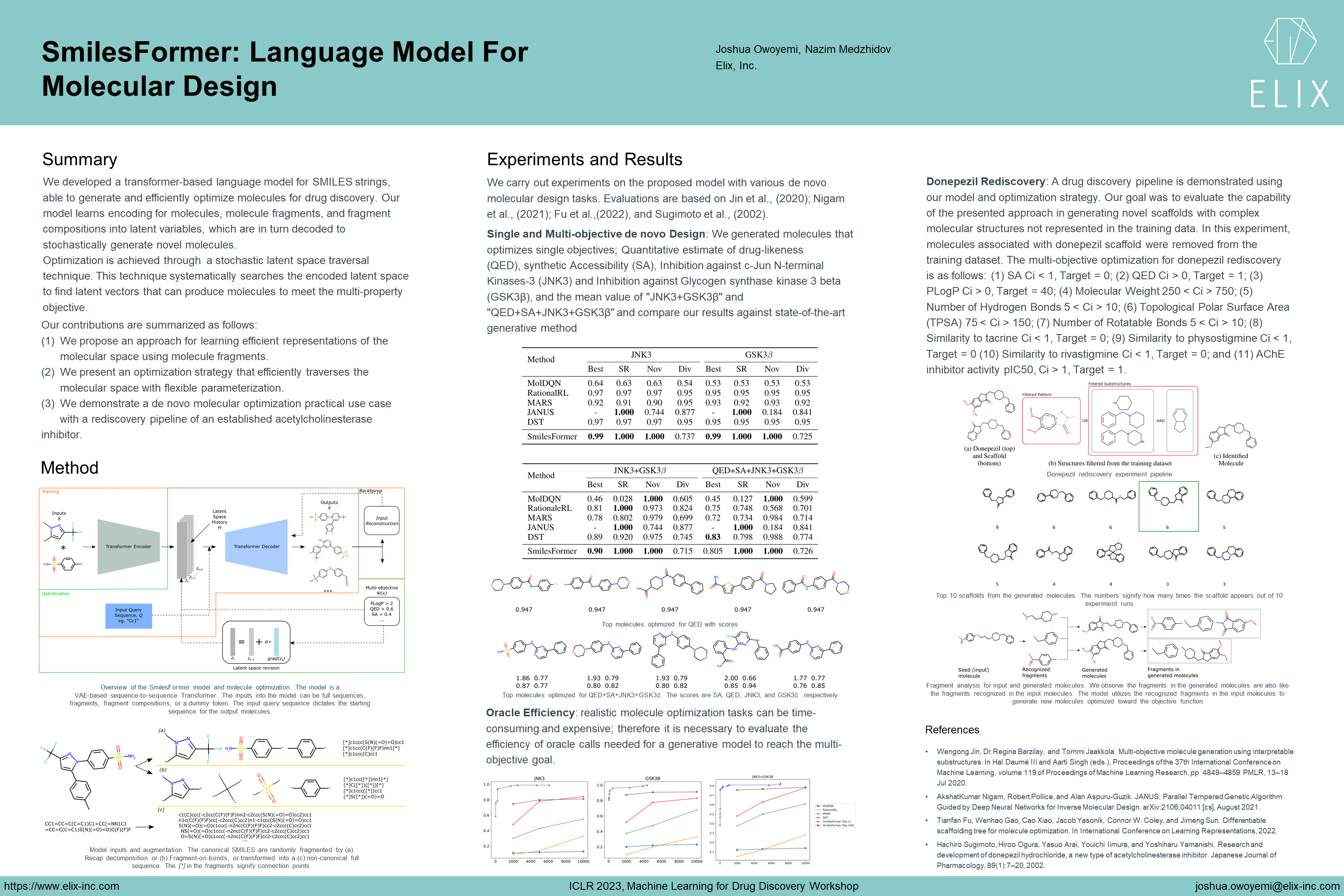 The objective of drug discovery is to find novel compounds with desirable chemical properties. Generative models have been utilized to sample molecules at the intersection of multiple property constraints. In this paper we pose molecular design as a language modeling problem where the model implicitly learns the vocabulary and composition of valid molecules, hence it is able to generate new molecules of interest. We present SmilesFormer, a Transformer-based model which is able to encode molecules, molecule fragments, and fragment compositions as latent variables, which are in turn decoded to stochastically generate novel molecules. This is achieved by fragmenting the molecules into smaller combinatorial groups, then learning the mapping between the input fragments and valid SMILES sequences. The model is able to optimize molecular properties through a stochastic latent space traversal technique. This technique systematically searches the encoded latent space to find latent vectors that are able to produce molecules to meet the multi-property objective. The model was validated through various de novo molecular design tasks, achieving state-of-the-art performances when compared to previous methods. Furthermore, we used the proposed method to demonstrate a drug rediscovery pipeline for Donepezil, a known Acetylcholinesterase Inhibitor.