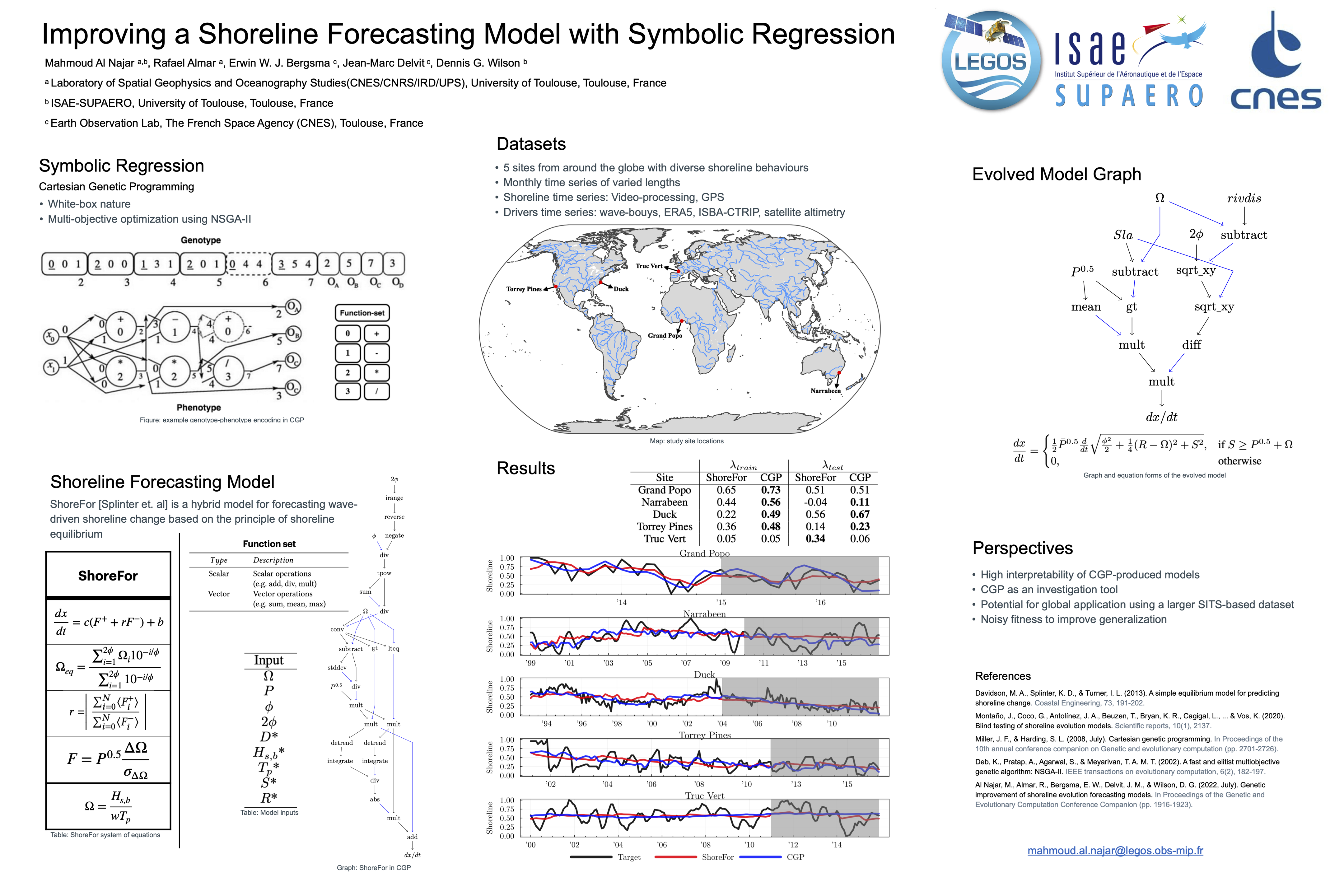 Given the current context of climate change and the increasing population densities at coastal zones around the globe, there is an increasing need to be able to predict the development of our coasts. Recent advances in artificial intelligence allow for automatic analysis of observational data. Symbolic Regression (SR) is a type of Machine Learning algorithm that aims to find interpretable symbolic expressions that can explain relations in the data. In this work, we aim to study the problem of forecasting shoreline change using SR. We make use of Cartesian Genetic Programming (CGP) in order to encode and improve upon ShoreFor, a physical shoreline prediction model. During training, CGP individuals are evaluated and selected according to their predictive score at five different coastal sites. This work presents a comparison between a CGP-evolved model and the base ShoreFor model. In addition to evolution's ability to produce well-performing models, it demonstrates the usefulness of SR as a research tool to gain insight into the behaviors of shorelines in various geographical zones.