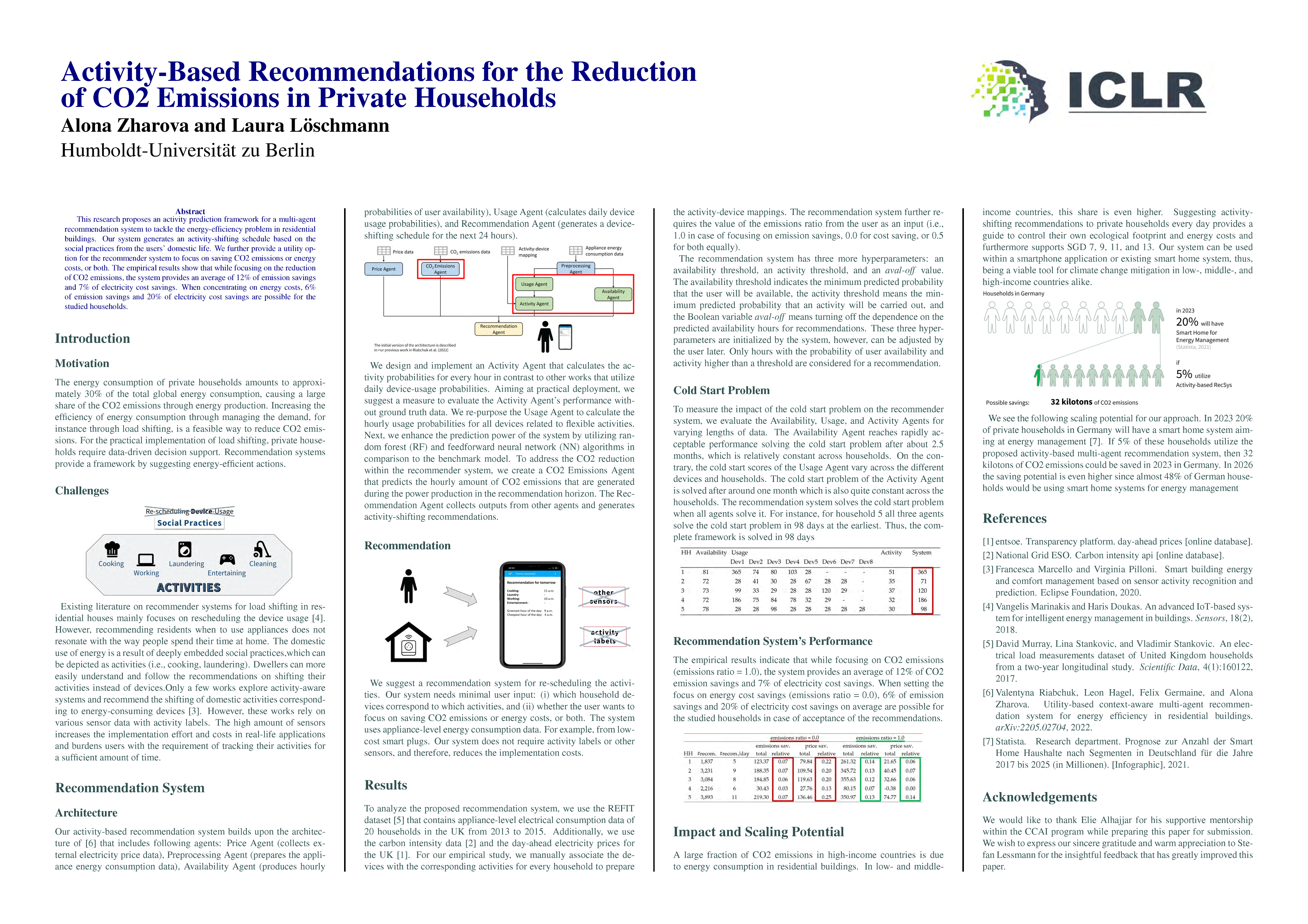 This paper proposes an activity prediction framework for a multi-agent recommendation system to tackle the energy-efficiency problem in residential buildings. Our system generates an activity-shifting schedule based on the social practices from the users’ domestic life. We further provide a utility option for the recommender system to focus on saving CO2 emissions or energy costs, or both. The empirical results show that while focusing on the reduction of CO2 emissions, the system provides an average of 12% of emission savings and 7% of electricity cost savings. When concentrating on energy costs, 6% of emission savings and 20% of electricity cost savings are possible for the studied households.