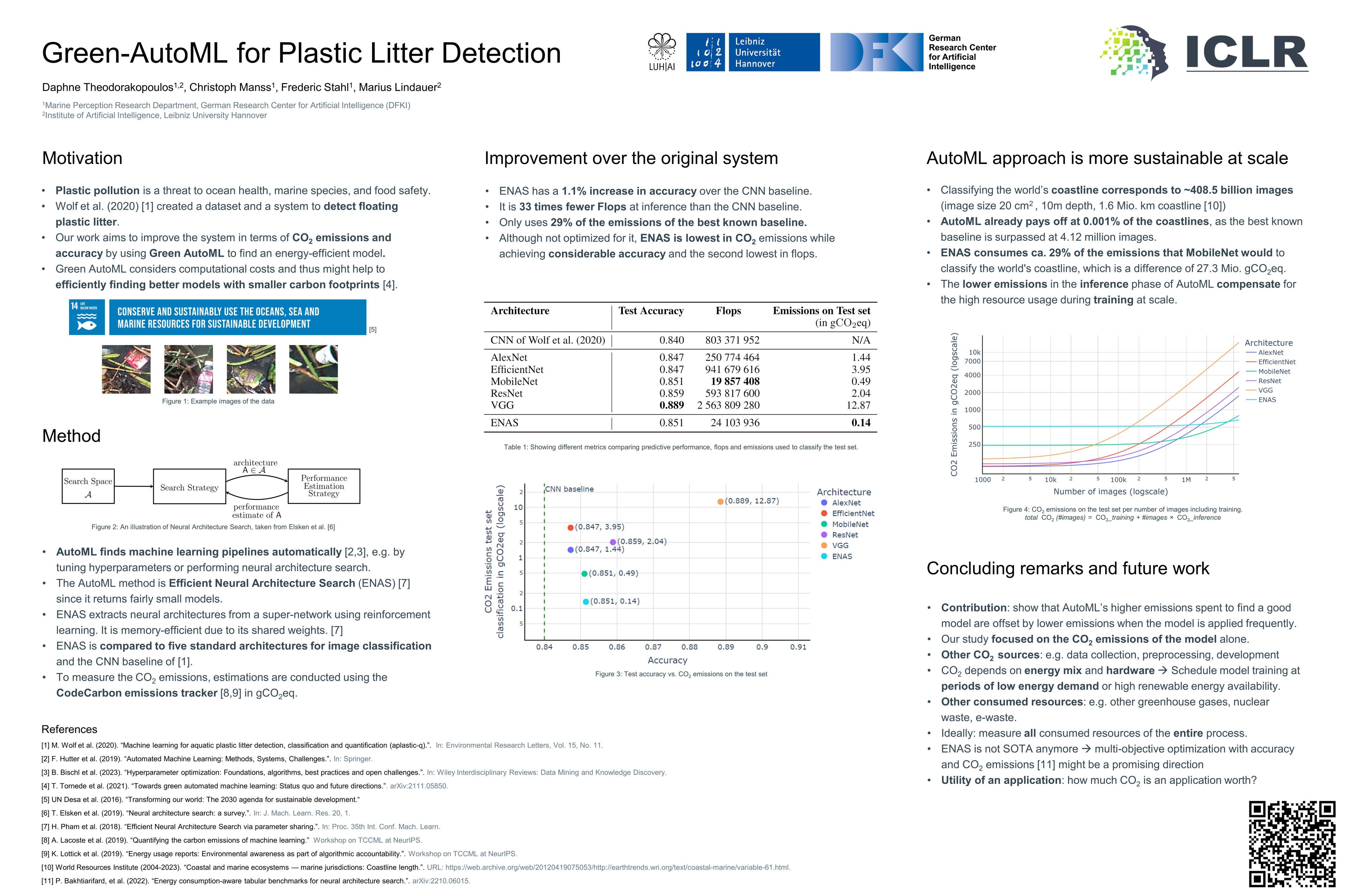 The world’s oceans are polluted with plastic waste and the detection of it is an important step toward removing it. Wolf et al. (2020) created a plastic waste dataset to develop a plastic detection system. Our work aims to improve the machine learning model by using Green Automated Machine Learning (AutoML). One aspect of Green-AutoML is to search for a machine learning pipeline while additionally minimizing the carbon footprint. In this work, we train five standard neural architectures for image classification on the aforementioned plastic waste dataset. Subsequently, their performance and carbon footprints are compared to an Efficient Neural Architecture Search as a well-known AutoML approach. We show the potential of Green-AutoML by outperforming the original plastic detection system by 1.1% in accuracy and using 33 times fewer floating point operations at inference, and only 28% of the carbon emissions of the best known baseline. This shows the large potential of AutoML on climate-change relevant applications and at the same time contributing to more efficient modern DL systems, saving substantial resources and reducing the carbon footprint.