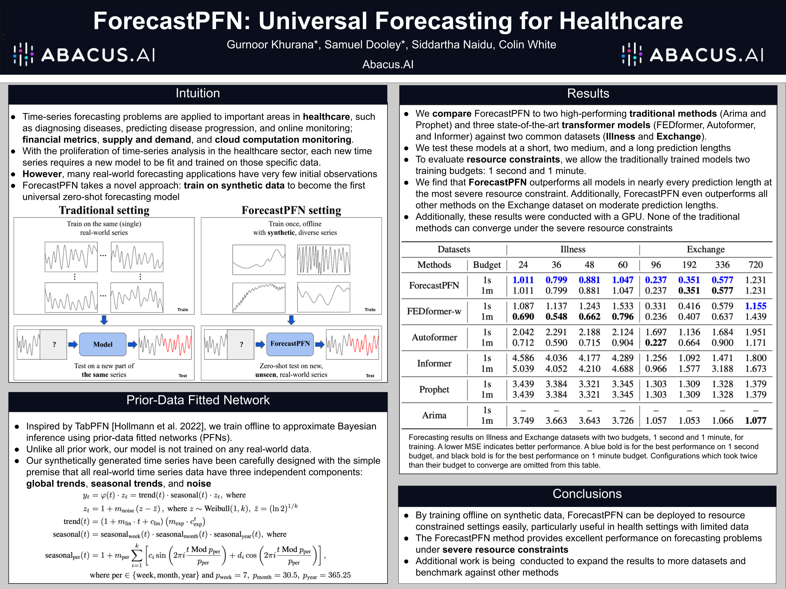 With the proliferation of time-series analysis in the healthcare sector, each new time series requires a new model to be fit and trained on those specific data. The vast majority of time-series forecasting approaches require a training dataset. There is very recent work on zero-shot forecasting---pretraining on one series and evaluating on another---yet its performance is inconsistent depending on the training dataset. In this work, we take a different approach and devise ForecastPFN, the first universal zero-shot model, pretrained purely on synthetic data. Drawing inspiration from TabPFN, a recent breakthrough in tabular data, ForecastPFN is the first forecasting model to approximate Bayesian inference. To accomplish this, we design a synthetic time-series distribution with local and global trends, and noise. Through experiments on multiple datasets, we show that ForecastPFN achieves competitive performance without ever seeing the training datasets, compared to popular methods that were fully trained on the training dataset.