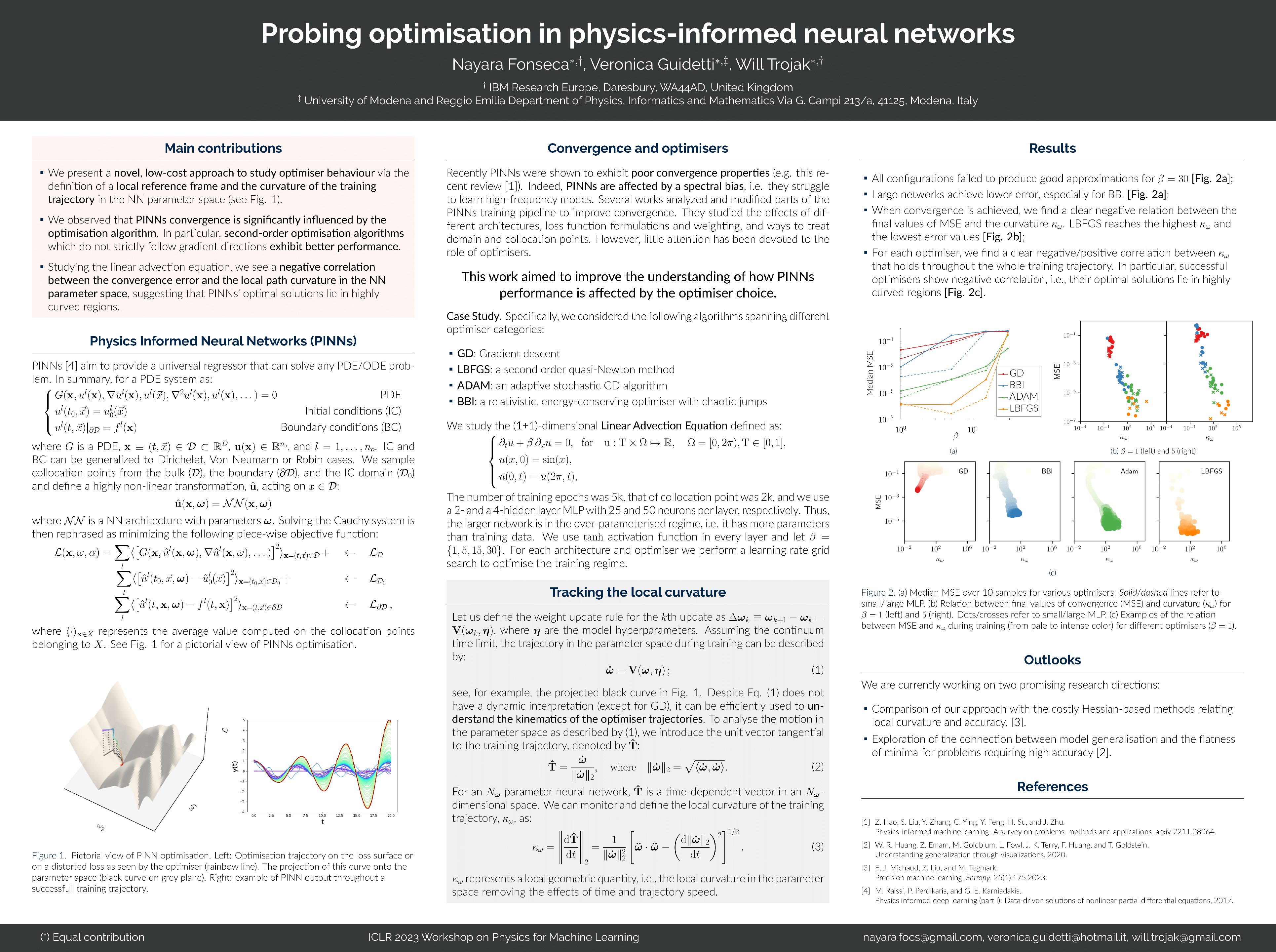 A novel comparison is presented of the effect of optimiser choice on the accuracy of physics-informed neural networks (PINNs). To give insight into why some optimisers are better, a new approach is proposed that tracks the training trajectory curvature and can be evaluated on the fly at a low computational cost. The linear advection equation is studied for several advective velocities, and we show that the optimiser choice substantially impacts PINNs model performance and accuracy. Furthermore, using the curvature measure, we found a negative correlation between the convergence error and the curvature in the optimiser local reference frame. It is concluded that, in this case, larger local curvature values result in better solutions. Consequently, optimisation of PINNs is made more difficult as minima are in highly curved regions.