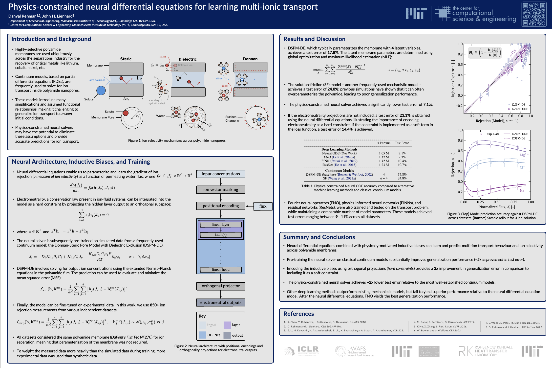 Continuum models for ion transport through polyamide nanopores require solving partial differential equations (PDEs) through complex pore geometries. Resolving spatiotemporal features at this length and time-scale can make solving these equations computationally intractable. In addition, mechanistic models frequently require functional relationships between ion interaction parameters under nano-confinement, which are often too challenging to measure experimentally or know a priori. In this work, we develop the first physics-informed deep learning model to learn ion transport behaviour across polyamide nanopores. The proposed architecture leverages neural differential equations in conjunction with classical closure models as inductive biases directly encoded into the neural framework. The neural differential equations are pre-trained on simulated data from continuum models and fine-tuned on independent experimental data to learn ion rejection behaviour. Gaussian noise augmentations from experimental uncertainty estimates are also introduced into the measured data to improve model generalization. Our approach is compared to other physics-informed deep learning models and shows strong agreement with experimental measurements across all studied datasets.
