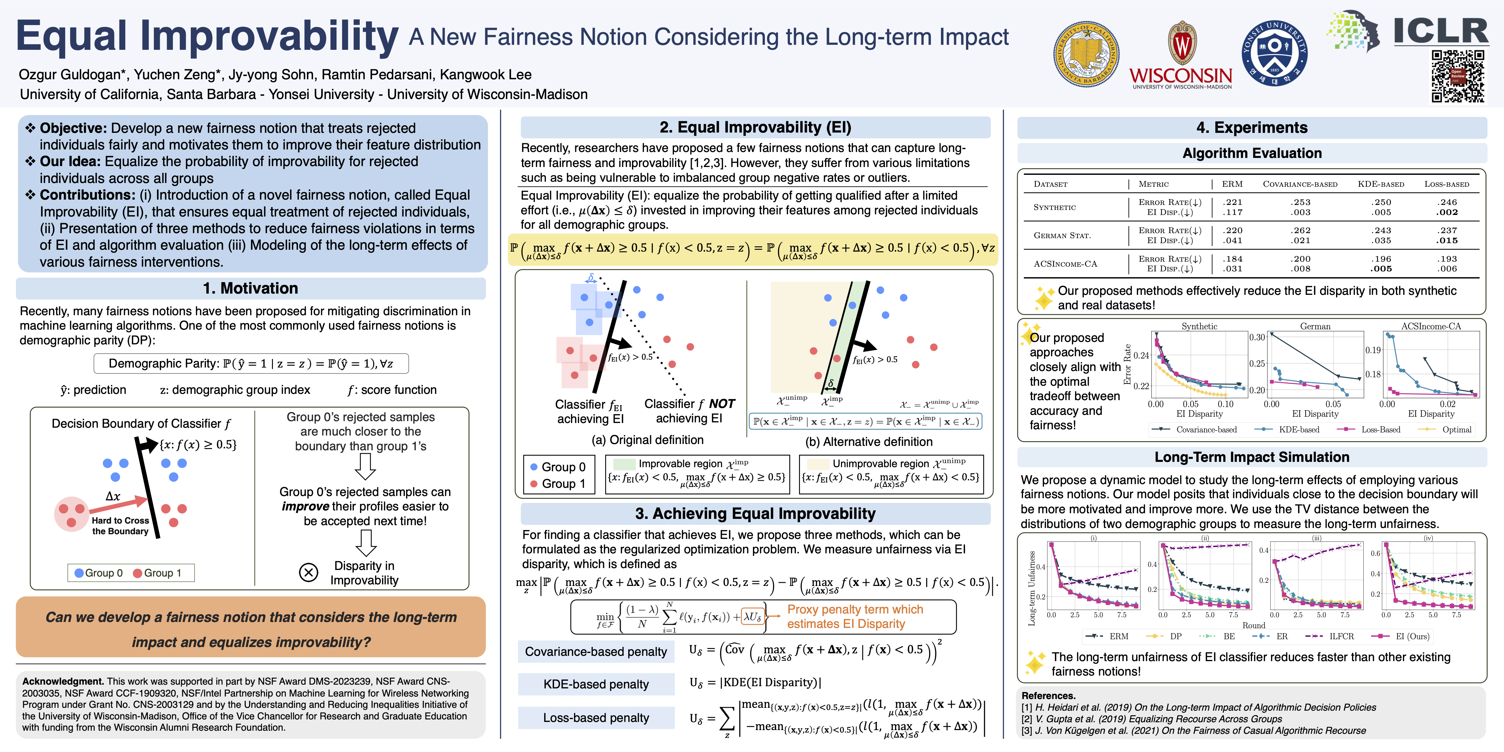 Devising a fair classifier that does not discriminate against different groups is an important problem in machine learning. Although researchers have proposed various ways of defining group fairness, most of them only focused on the immediate fairness, ignoring the long-term impact of a fair classifier under the dynamic scenario where each individual can improve its feature over time. Such dynamic scenarios happen in real world, e.g., college admission and credit loaning, where each rejected sample makes effort to change its features to get accepted afterwards. In this dynamic setting, the long-term fairness should equalize the samples’ feature distribution across different groups after the rejected samples make some effort to improve. In order to promote long-term fairness, we propose a new fairness notion called Equal Improvability (EI), which equalizes the potential acceptance rate of the rejected samples across different groups assuming a bounded level of effort will be spent by each rejected sample. We analyze the properties of EI and its connections with existing fairness notions. To find a classifier that satisfies the EI requirement, we propose and study three different approaches that solve EI regularized optimization problems. Through experiments on both synthetic and real datasets, we demonstrate that the proposed EI-regularized algorithms encourage us to find a fair classifier in terms of EI. Finally, we provide experimental results on dynamic scenarios which highlight the advantages of our EI metric in achieving the long-term fairness. Codes are available in anonymous GitHub repository.