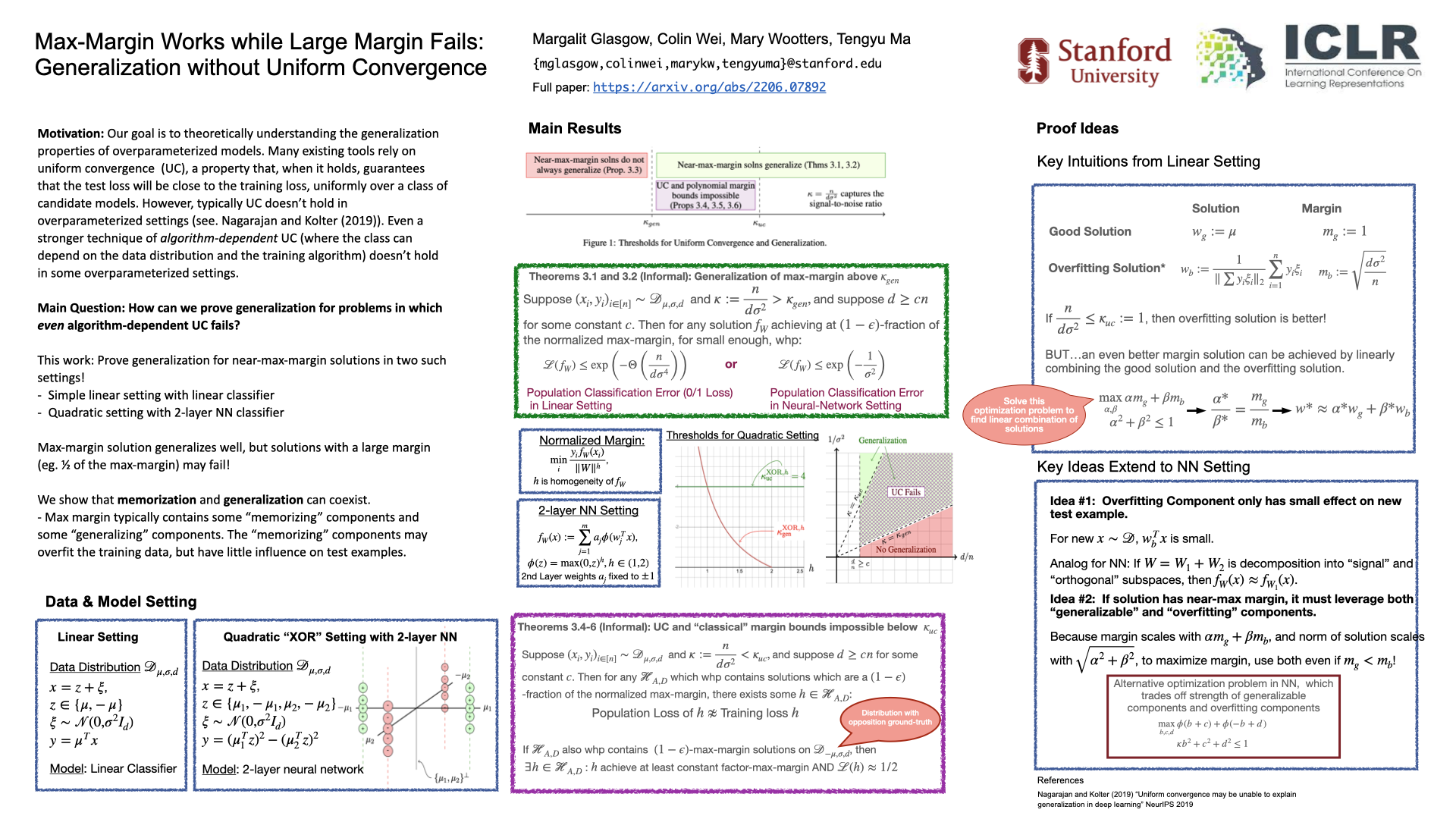 A major challenge in modern machine learning is theoretically understanding the generalization properties of overparameterized models. Many existing tools rely on uniform convergence (UC), a property that, when it holds, guarantees that the test loss will be close to the training loss, uniformly over a class of candidate models. Nagarajan and Kolter (2019) show that in certain simple linear and neural-network settings, any uniform convergence bound will be vacuous, leaving open the question of how to prove generalization in settings where UC fails. Our main contribution is proving novel generalization bounds in two such settings, one linear, and one non-linear. We study the linear classification setting of Nagarajan and Kolter (2019), and a quadratic ground truth function learned via a two-layer neural network in the non-linear regime. We prove a new type of margin bound showing that above a certain signal-to-noise threshold, any near-max-margin classifier will achieve almost no test loss in these two settings. Our results show that near-max-margin is important: while any model that achieves at least a $(1 - \epsilon)$-fraction of the max-margin generalizes well, a classifier achieving half of the max-margin may fail terribly. Our analysis provides insight on why memorization can coexist with generalization: we show that in this challenging regime where generalization occurs but UC fails, near-max-margin classifiers simultaneously contain some generalizable components and some overfitting components that memorize the data. The presence of the overfitting components is enough to preclude UC, but the near-extremal margin guarantees that sufficient generalizable components are present.