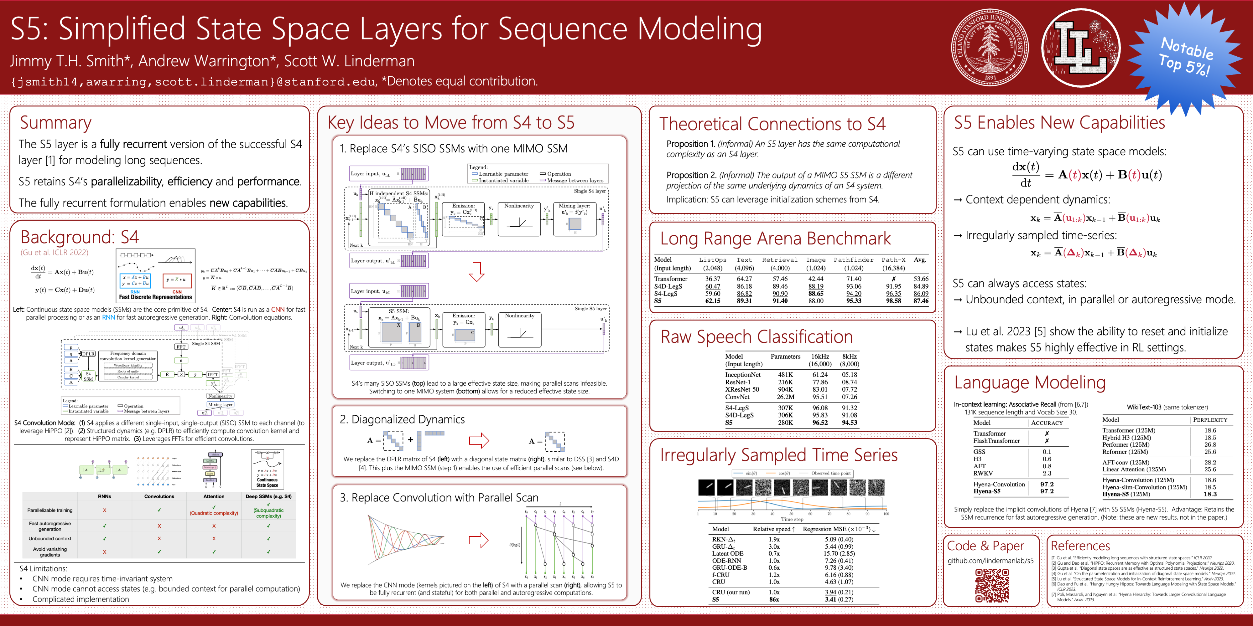Models using structured state space sequence (S4) layers have achieved state-of-the-art performance on long-range sequence modeling tasks. An S4 layer combines linear state space models (SSMs), the HiPPO framework, and deep learning to achieve high performance. We build on the design of the S4 layer and introduce a new state space layer, the S5 layer. Whereas an S4 layer uses many independent single-input, single-output SSMs, the S5 layer uses one multi-input, multi-output SSM. We establish a connection between S5 and S4, and use this to develop the initialization and parameterization used by the S5 model. The result is a state space layer that can leverage efficient and widely implemented parallel scans, allowing S5 to match the computational efficiency of S4, while also achieving state-of-the-art performance on several long-range sequence modeling tasks. S5 averages $87.4\%$ on the long range arena benchmark, and $98.5\%$ on the most difficult Path-X task.