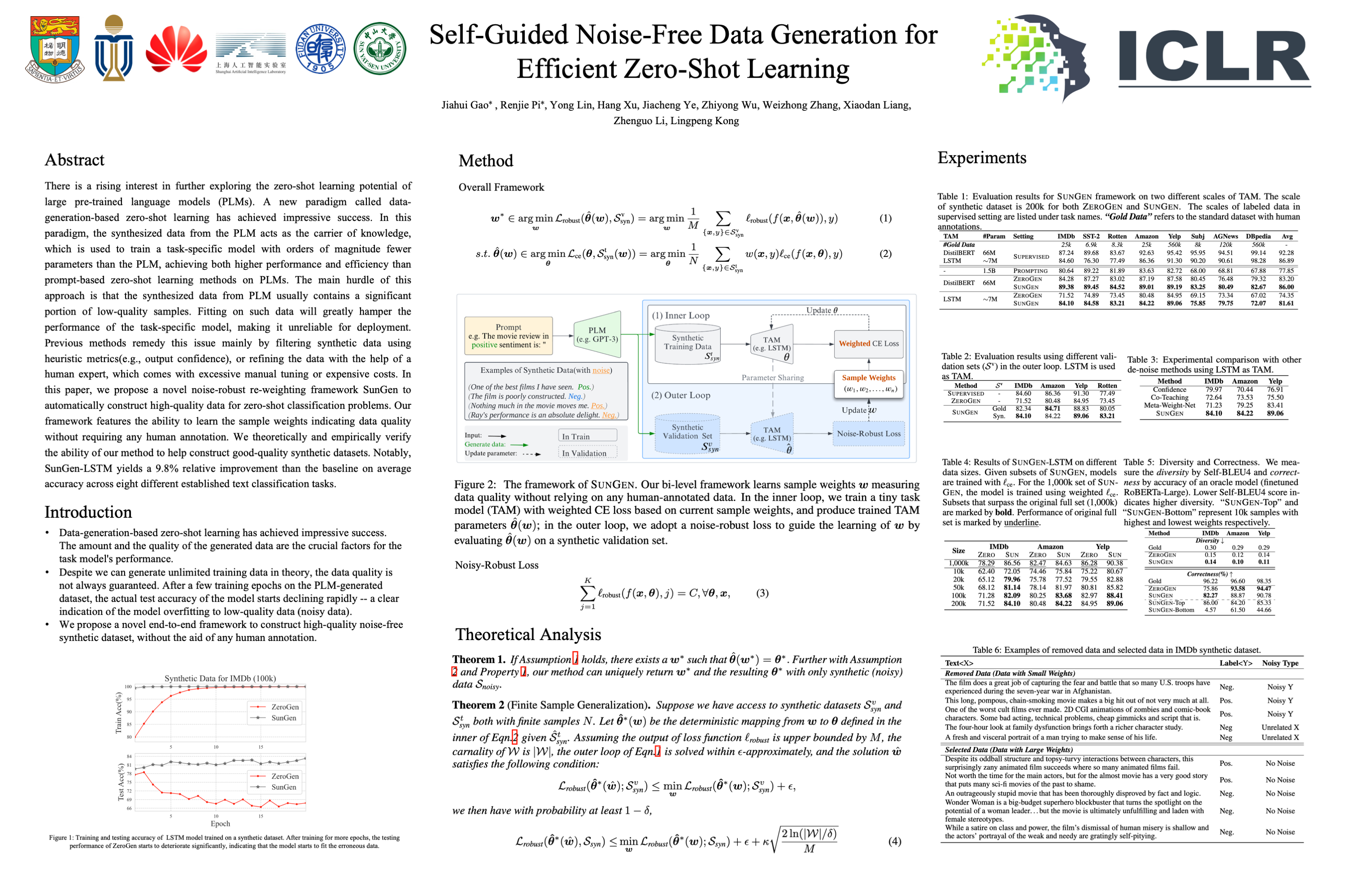 There is a rising interest in further exploring the zero-shot learning potential of large pre-trained language models (PLMs). A new paradigm called data-generation-based zero-shot learning has achieved impressive success. In this paradigm, the synthesized data from the PLM acts as the carrier of knowledge, which is used to train a task-specific model with orders of magnitude fewer parameters than the PLM, achieving both higher performance and efficiency than prompt-based zero-shot learning methods on PLMs. The main hurdle of this approach is that the synthesized data from PLM usually contains a significant portion of low-quality samples. Fitting on such data will greatly hamper the performance of the task-specific model, making it unreliable for deployment. Previous methods remedy this issue mainly by filtering synthetic data using heuristic metrics(e.g., output confidence), or refining the data with the help of a human expert, which comes with excessive manual tuning or expensive costs. In this paper, we propose a novel noise-robust re-weighting framework SunGen to automatically construct high-quality data for zero-shot classification problems. Our framework features the ability to learn the sample weights indicating data quality without requiring any human annotation. We theoretically and empirically verify the ability of our method to help construct good-quality synthetic datasets. Notably, SunGen-LSTM yields a 9.8% relative improvement than the baseline on average accuracy across eight different established text classification tasks.