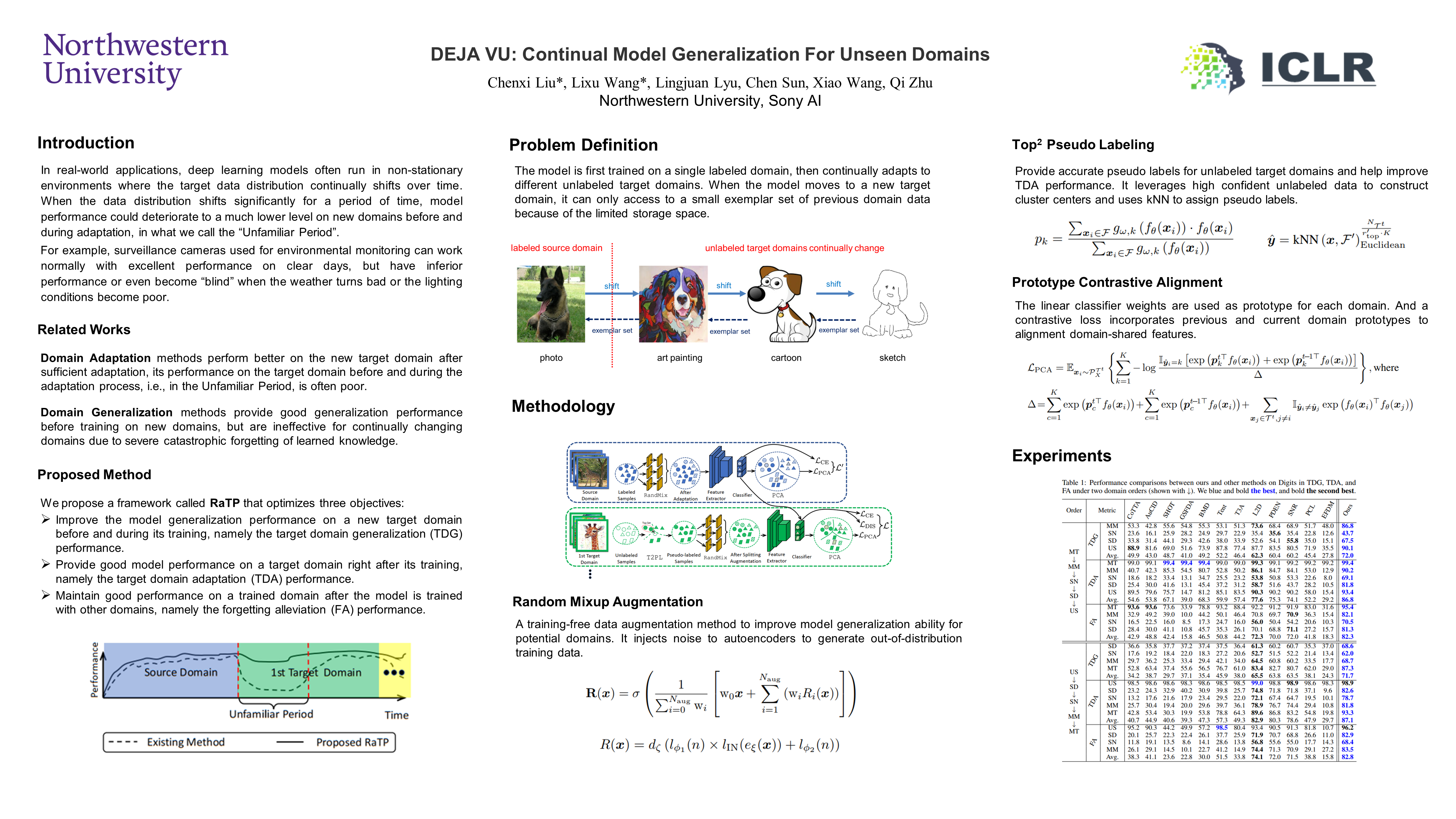 In real-world applications, deep learning models often run in non-stationary environments where the target data distribution continually shifts over time. There have been numerous domain adaptation (DA) methods in both online and offline modes to improve cross-domain adaptation ability. However, these DA methods typically only provide good performance after a long period of adaptation, and perform poorly on new domains before and during adaptation – in what we call the “Unfamiliar Period”, especially when domain shifts happen suddenly and significantly. On the other hand, domain generalization (DG) methods have been proposed to improve the model generalization ability on unadapted domains. However, existing DG works are ineffective for continually changing domains due to severe catastrophic forgetting of learned knowledge. To overcome these limitations of DA and DG in handling the Unfamiliar Period during continual domain shift, we propose RaTP, a framework that focuses on improving models’ target domain generalization (TDG) capability, while also achieving effective target domain adaptation (TDA) capability right after training on certain domains and forgetting alleviation (FA) capability on past domains. RaTP includes a training-free data augmentation module to prepare data for TDG, a novel pseudo-labeling mechanism to provide reliable supervision for TDA, and a prototype contrastive alignment algorithm to align different domains for achieving TDG, TDA and FA. Extensive experiments on Digits, PACS, and DomainNet demonstrate that RaTP significantly outperforms state-of-the-art works from Continual DA, Source-Free DA, Test-Time/Online DA, Single DG, Multiple DG and Unified DA&DG in TDG, and achieves comparable TDA and FA capabilities.