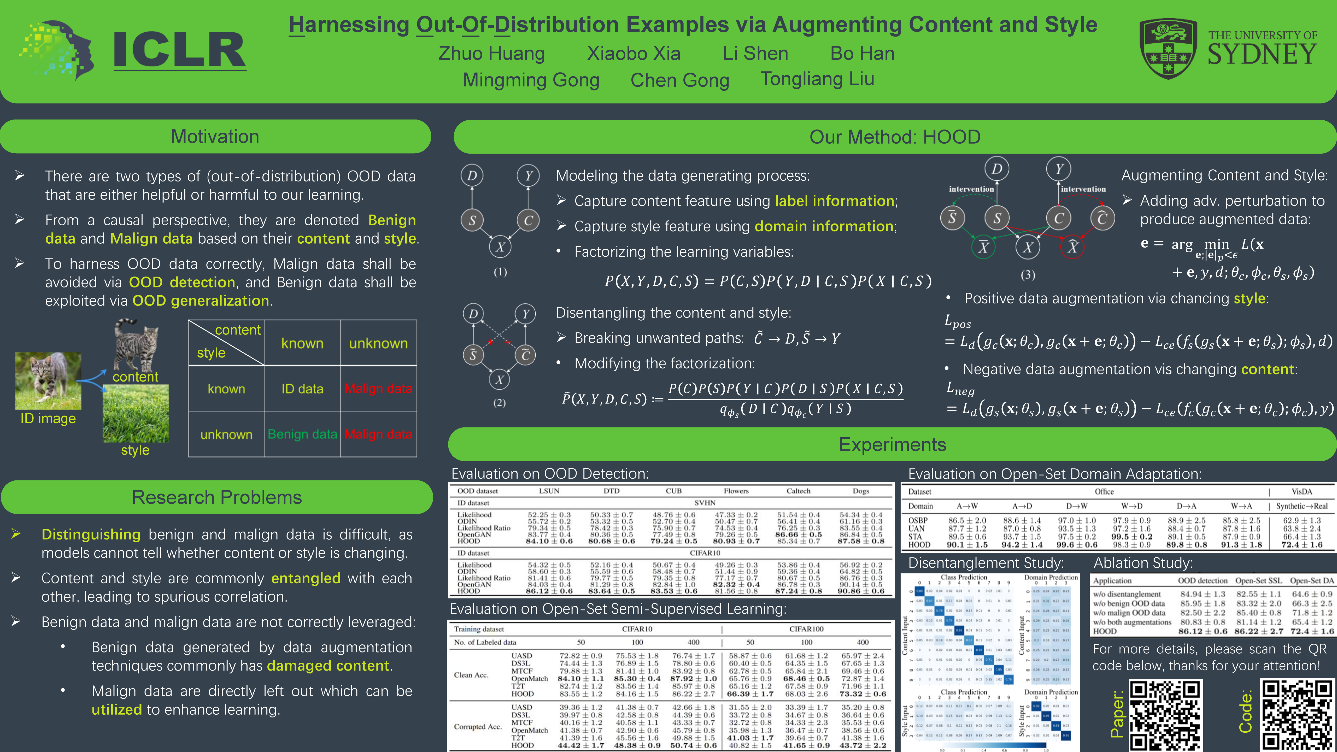 Machine learning models are vulnerable to Out-Of-Distribution (OOD) examples, such a problem has drawn much attention. However, current methods lack a full understanding of different types of OOD data: there are benign OOD data that can be properly adapted to enhance the learning performance, while other malign OOD data would severely degenerate the classification result. To Harness OOD data, this paper proposes HOOD method that can leverage the content and style from each image instance to identify benign and malign OOD data. Particularly, we design a variational inference framework to causally disentangle content and style features by constructing a structural causal model. Subsequently, we augment the content and style through an intervention process to produce malign and benign OOD data, respectively. The benign OOD data contain novel styles but hold our interested contents, and they can be leveraged to help train a style-invariant model. In contrast, the malign OOD data inherit unknown contents but carry familiar styles, by detecting them can improve model robustness against deceiving anomalies. Thanks to the proposed novel disentanglement and data augmentation techniques, HOOD can effectively deal with OOD examples in unknown and open environments, whose effectiveness is empirically validated in three typical OOD applications including OOD detection, open-set semi-supervised learning, and open-set domain adaptation.