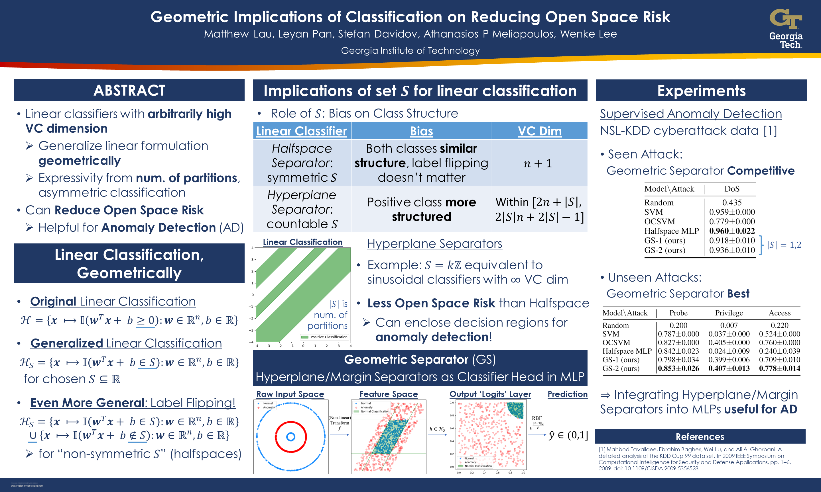 To reduce open space risk of hypotheses, we reexamine the 'simplest' hypothesis class, binary linear classifiers, geometrically.Providing a generalized formulation,we establish a surprising fact: linear classifiers can have arbitrarily high VC dimension, stemming from increasing the number of partitions in input space.Hence, linear classifiers with multiple margins are more expressive than single-margin classifiers.Despite a higher VC dimension, such classifiers have less open space risk than halfspace separators.These geometric insights are useful to detect unseen classes, while probabilistic modeling of risk minimization helps with seen classes. In supervised anomaly detection, we show that a classifier that combines a probabilistic and geometric lens can detect both seen and unseen anomalies well.
