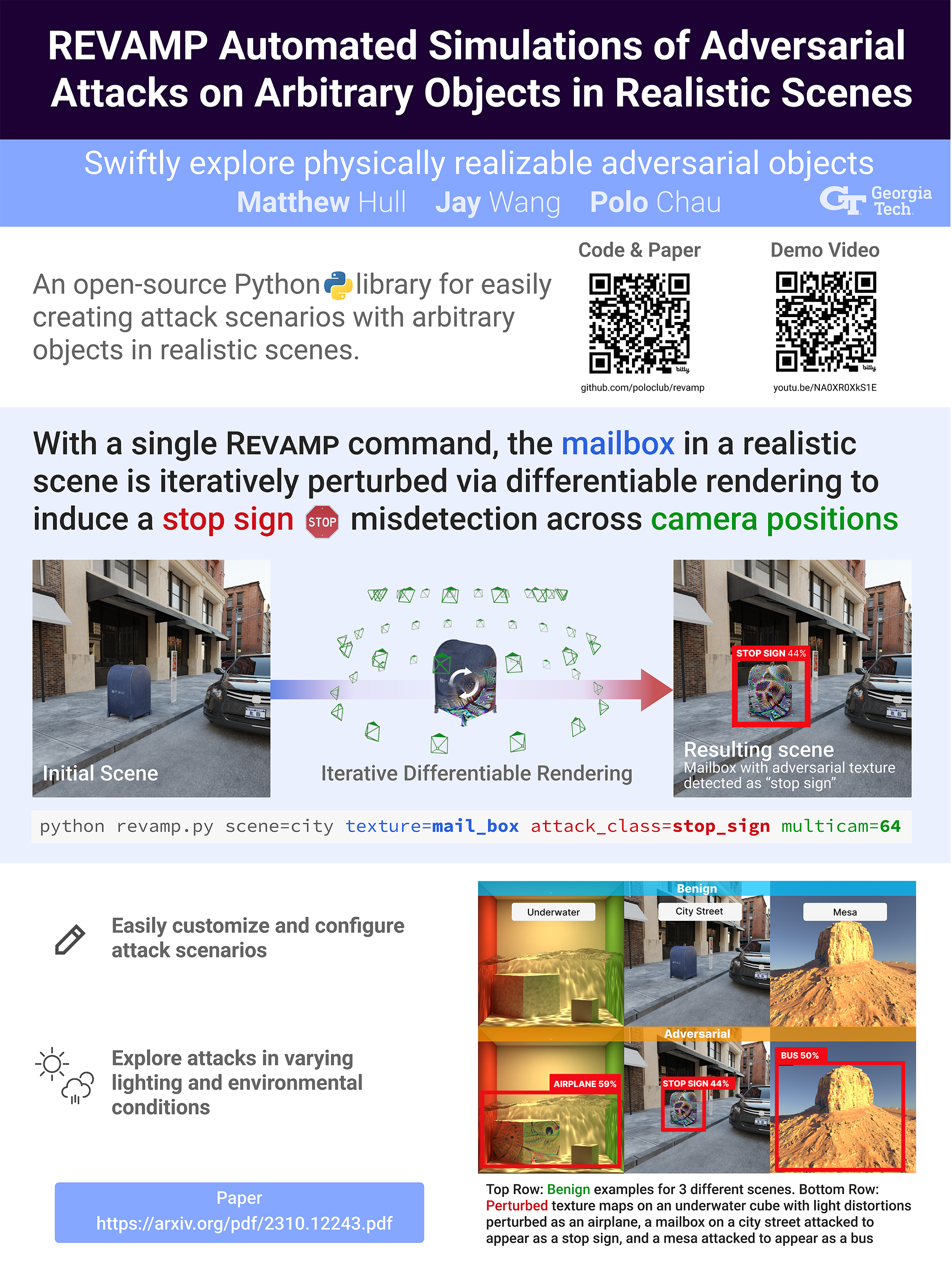 Deep learning models, such as those used in autonomous vehicles are vulnerable to adversarial attacks where attackers could place adversarial objects in the environment to induce incorrect detections. While generating such adversarial objects in the digital realm is well-studied, successfully transferring these attacks to the physical realm remains challenging, especially when accounting for real-world environmental factors. We address these challenges with REVAMP, a first-of-its-kind Python library for creating attack scenarios with arbitrary objects in scenes with realistic environmental factors, lighting, reflection, and refraction. REVAMP empowers researchers and practitioners to swiftly explore diverse scenarios, offering a wide range of configurable options for experiment design and using differentiable rendering to replicate physically-plausible adversarial objects. REVAMP is open-source and available at https://anonymous.4open.science/r/revamp and a demo video is available at https://youtu.be/ogCRO15R7-E.