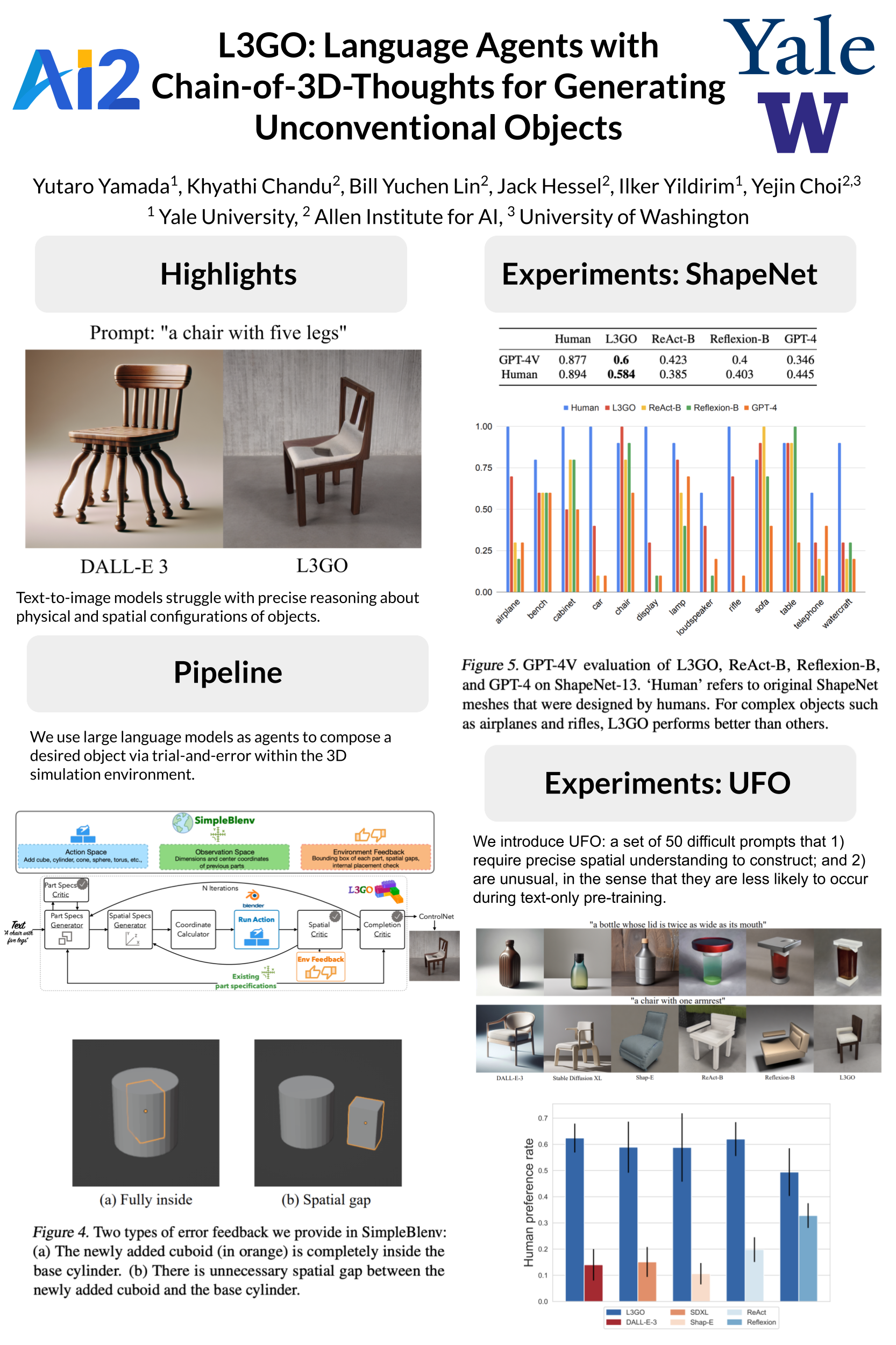 Diffusion-based image generation models such as DALL-E 3 and Stable Diffusion-XL demonstrate remarkable capabilities in generating images with realistic and unique compositions. Yet, these models are not robust in precisely reasoning about physical and spatial configurations of objects, especially when instructed with unconventional, thereby out-of-distribution descriptions, such as “a chair with five legs”. In this paper, we propose an language agent with chain-of-3D-thoughts (L3GO), an inference-time approach that can reason about part-based 3D construction of unconventional objects that current data-driven diffusion models struggle with. More concretely, we use large language models as agents to compose a desired object via trial-and-error within the 3D simulation environment. To facilitate our investigation, we develop a new benchmark, Unconventionally Feasible Objects (UFO), as well as SimpleBlenv, a wrapper environment built on top of Blender where language agents can build and compose atomic building blocks via API calls. Human and automatic GPT-4V evaluations show that our approach surpasses the standard GPT-4 and other language agents (e.g., ReAct and Reflexion) for 3D mesh generation on ShapeNet. Moreover, when tested on our UFO benchmark, our approach outperforms other state-of-the-art text-to-2D image and text-to-3D models based on human evaluation.