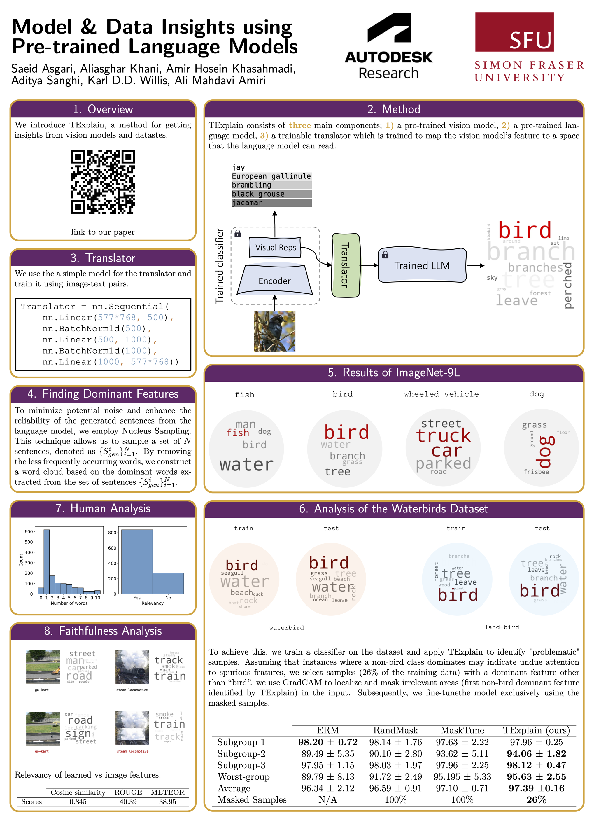We propose TExplain, using language models to interpret pre-trained image classifiers' features. Our approach connects the feature space of image classifiers with language models, generating explanatory sentences during inference. By extracting frequent words from such explanations, we gain insights into learned features and patterns. This method detects spurious correlations and biases within a dataset, providing a deeper understanding of the classifier's behavior. Experimental validation on diverse datasets, including ImageNet-9L and Waterbirds, shows potential for improving interpretability and robustness in image classifiers.