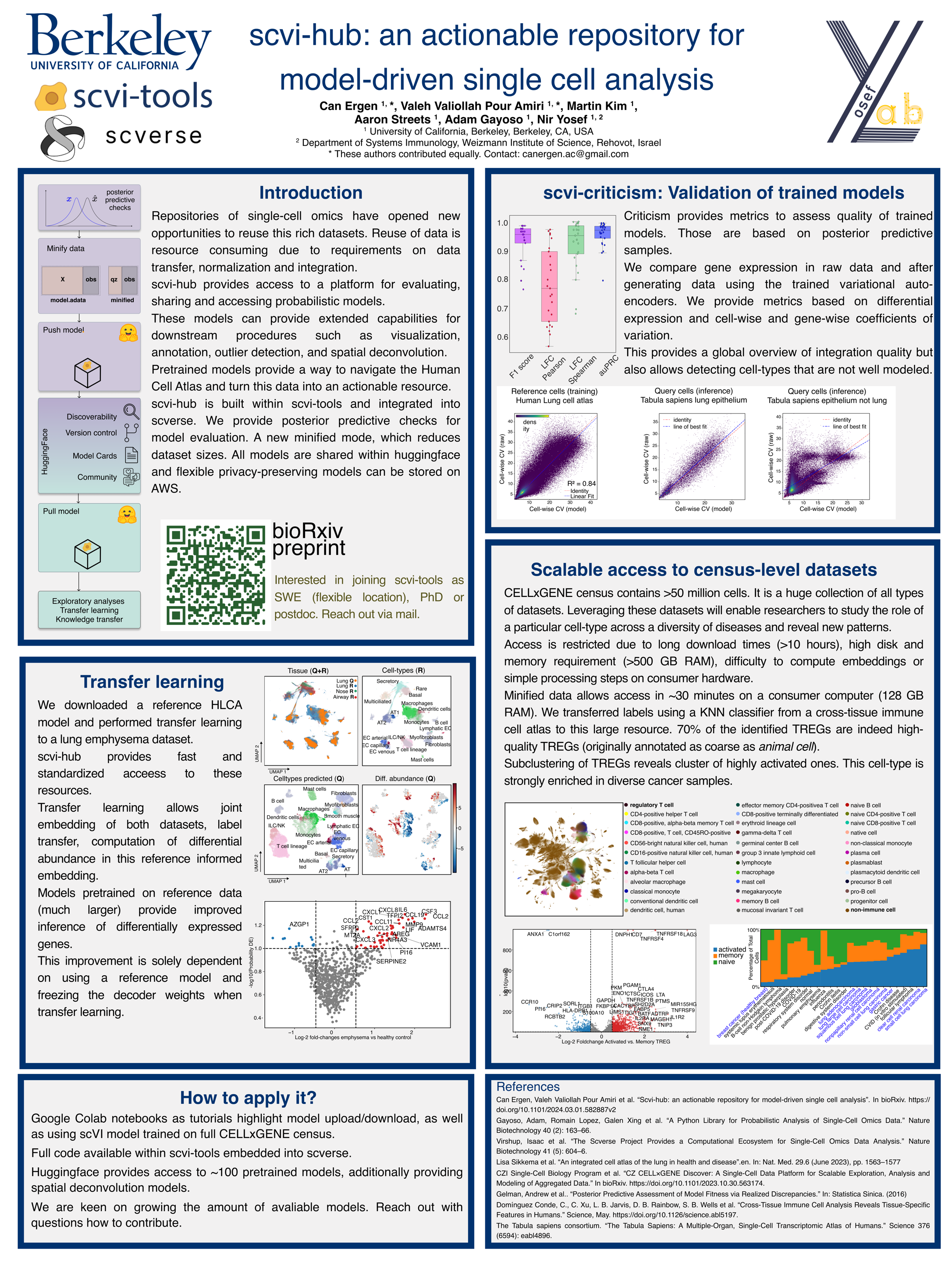 The accumulation of single-cell omics datasets in the public domain has openednew opportunities to reuse and leverage the vast amount of information they con-tain. Such uses, however, are complicated by the need for complex and resource-consuming procedures for data transfer, normalization, and integration that mustbe addressed prior to any analysis. Here we present scvi-hub: a platform for evalu-ating, sharing, and accessing probabilistic models that were trained on single-cellomics datasets. We demonstrate that these pre-trained models allow immediateaccess to a slew of fundamental tasks like visualization, imputation, annotation,outlier detection, and deconvolution of new (query) datasets with a much lowerrequirement for compute resources. We also show that pretrained models can helpdrive new discoveries with the existing (reference) datasets through rapid, model-based analyses. Scvi-hub is built within scvi-tools and integrated into scverse.Scvi-hub is publicly available to enable efficient sharing of single-cell omic stud-ies, and also to put advanced capabilities for transfer learning at the fingertips ofa broad community of users. We provide an extended journal version on bioRxiv