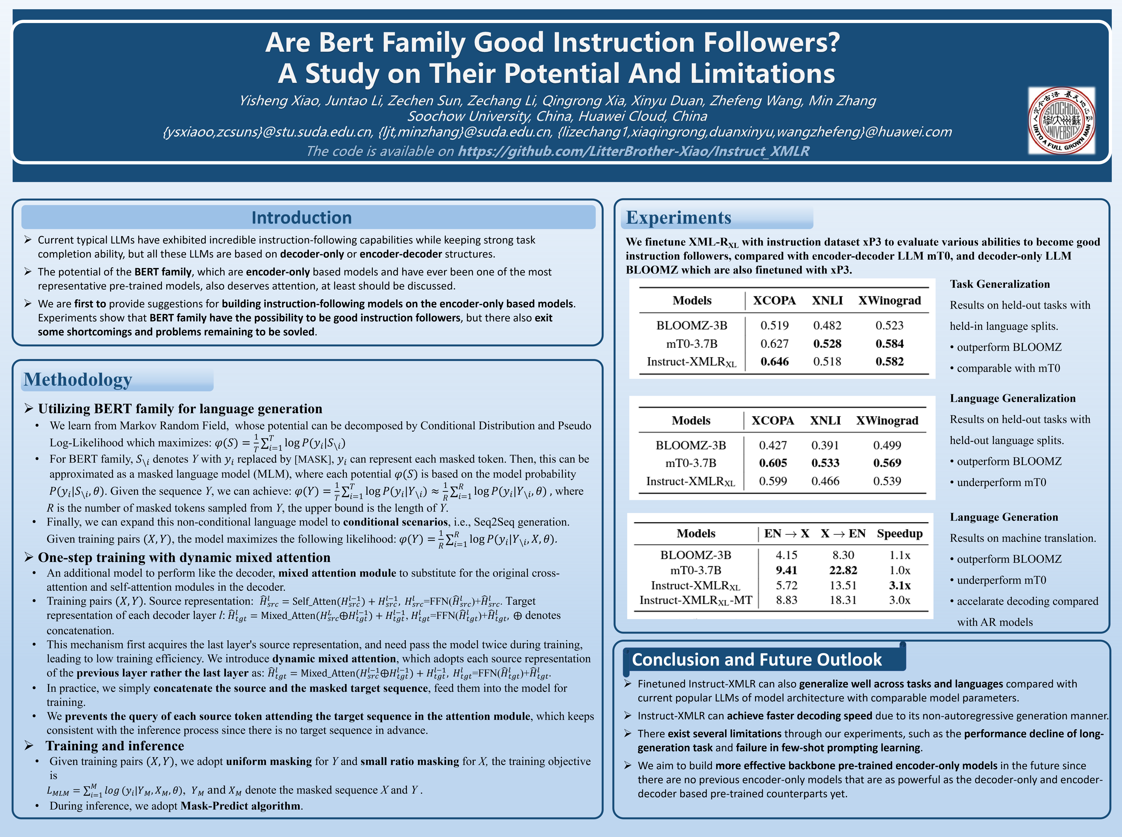 Language modeling at scale has proven very effective and brought unprecedented success to natural language models. Many typical representatives, especially decoder-only models, e.g., BLOOM and LLaMA, and encoder-decoder models, e.g., Flan-T5 and AlexaTM, have exhibited incredible instruction-following capabilities while keeping strong task completion ability. These large language models can achieve superior performance in various tasks and even yield emergent capabilities, e.g., reasoning and universal generalization. Though the above two paradigms are mainstream and well explored, the potential of the BERT family, which are encoder-only based models and have ever been one of the most representative pre-trained models, also deserves attention, at least should be discussed. In this work, we adopt XML-R to explore the effectiveness of the BERT family for instruction following and zero-shot learning. We first design a simple yet effective strategy to utilize the encoder-only models for generation tasks and then conduct multi-task instruction tuning. Experimental results demonstrate that our fine-tuned model, Instruct-XMLR, outperforms Bloomz on all evaluation tasks and achieves comparable performance with mT0 on most tasks. Surprisingly, Instruct-XMLR also possesses strong task and language generalization abilities, indicating that Instruct-XMLR can also serve as a good instruction follower and zero-shot learner. Besides, Instruct-XMLR can accelerate decoding due to its non-autoregressive generation manner, achieving around 3 times speedup compared with current autoregressive large language models. Although we also witnessed several limitations through our experiments, such as the performance decline in long-generation tasks and the shortcoming of length prediction, Instruct-XMLR can still become a good member of the family of current large language models.