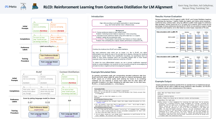 We propose Reinforcement Learning from Contrastive Distillation (RLCD), a method for aligning language models to follow principles expressed in natural language (e.g., to be more harmless) without using human feedback. RLCD creates preference pairs from two contrasting model outputs, one using a positive prompt designed to encourage following the given principles, and one using a negative prompt designed to encourage violating them. Using two different prompts causes model outputs to be more differentiated on average, resulting in cleaner preference labels in the absence of human annotations. We then use the preference pairs to train a preference model, which is in turn used to improve a base unaligned language model via reinforcement learning. Empirically, RLCD outperforms RLAIF (Bai et al., 2022b) and context distillation (Huang et al., 2022) baselines across three diverse alignment tasks—harmlessness, helpfulness, and story outline generation—and when using both 7B and 30B model scales for simulating preference data