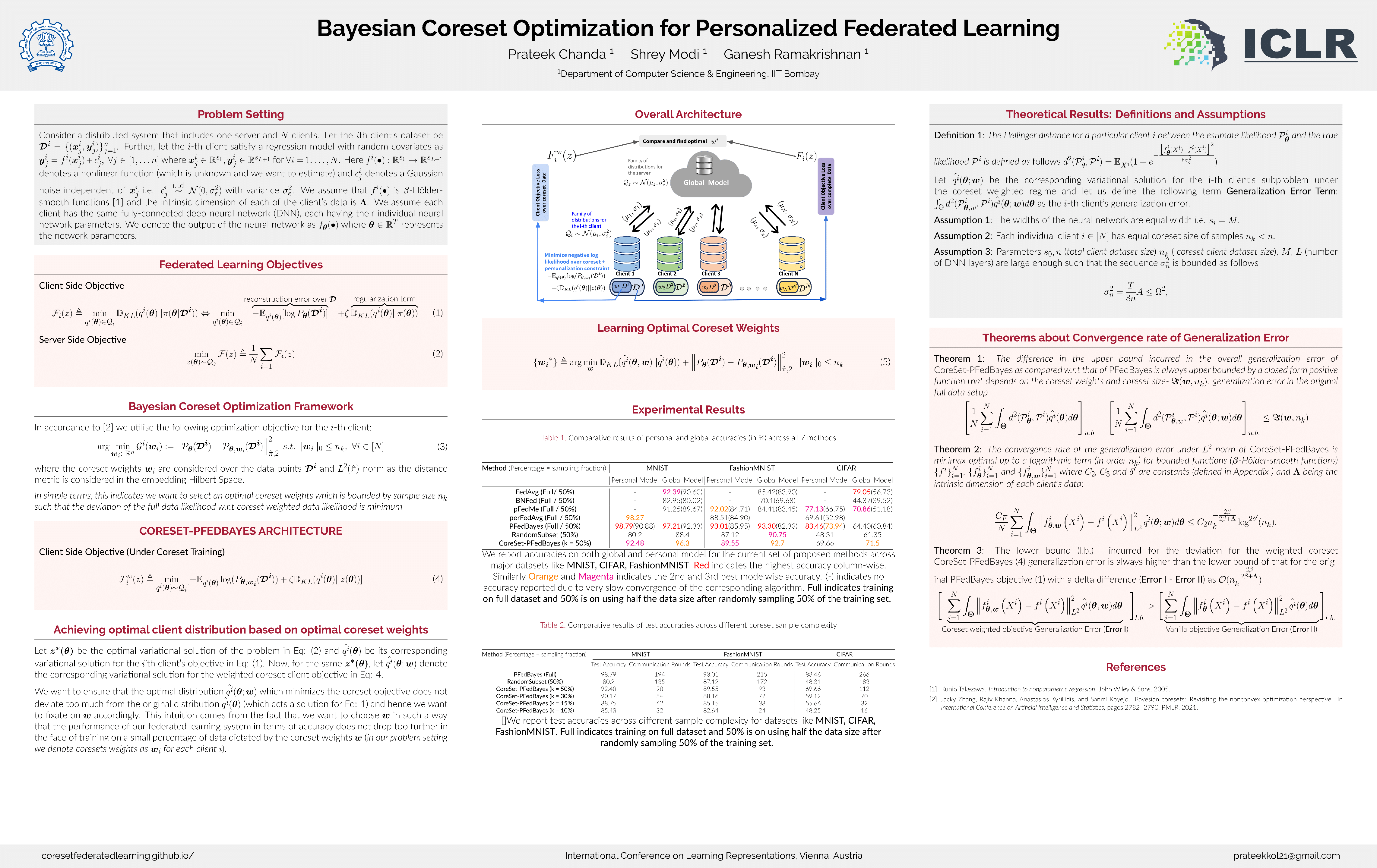 In a distributed machine learning setting like Federated Learning where there are multiple clients involved which update their individual weights to a single central server, often training on the entire individual client's dataset for each client becomes cumbersome. To address this issue we propose CORESET-PFEDBAYES : a personalized coreset weighted federated learning setup where the training updates for each individual clients are forwarded to the central server based on only individual client coreset based representative data points instead of the entire client data. Through theoretical analysis we present how the average generalization error is minimax optimal up to logarithm bounds (upper bounded by $\mathcal{O}(n_k^{-\frac{2 \beta}{2 \beta+\boldsymbol{\Lambda}}} \log ^{2 \delta^{\prime}}(n_k))$) and lower bounds of $\mathcal{O}(n_k^{-\frac{2 \beta}{2 \beta+\boldsymbol{\Lambda}}})$, and how the overall generalization error on the data likelihood differs from a vanilla Federated Learning setup as a closed form function ${\boldsymbol{\Im}}(\boldsymbol{w}, n_k)$ of the coreset weights $\boldsymbol{w}$ and coreset sample size $n_k$. Our experiments on different benchmark datasets based on a variety of recent personalized federated learning architectures show significant gains as compared to random sampling on the training data followed by federated learning, thereby indicating how intelligently selecting such training samples can help in performance. Additionally, through experiments on medical datasets our proposed method showcases some gains as compared to other submodular optimization based approaches used for subset selection on client's data.