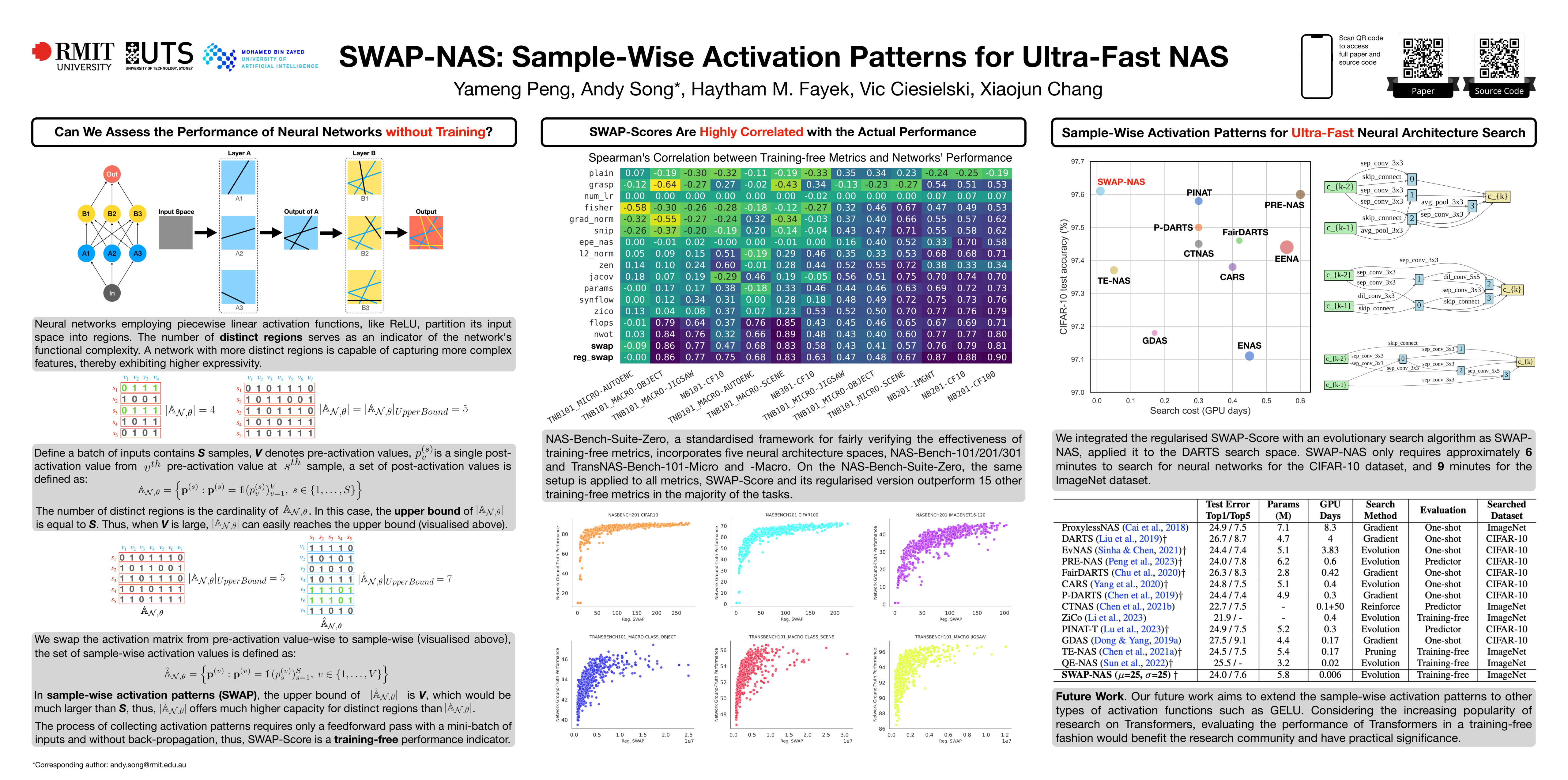 Training-free metrics (a.k.a. zero-cost proxies) are widely used to avoid resource-intensive neural network training, especially in Neural Architecture Search (NAS). Recent studies show that existing training-free metrics have several limitations, such as limited correlation and poor generalisation across different search spaces and tasks. Hence, we propose Sample-Wise Activation Patterns and its derivative, SWAP-Score, a novel high-performance training-free metric. It measures the expressivity of networks over a batch of input samples. The SWAP-Score is strongly correlated with ground-truth performance across various search spaces and tasks, outperforming 15 existing training-free metrics on NAS-Bench-101/201/301 and TransNAS-Bench-101. The SWAP-Score can be further enhanced by regularisation, which leads to even higher correlations in cell-based search space and enables model size control during the search. For example, Spearman’s rank correlation coefficient between regularised SWAP-Score and CIFAR-100 validation accuracies on NAS-Bench-201 networks is 0.90, significantly higher than 0.80 from the second-best metric, NWOT. When integrated with an evolutionary algorithm for NAS, our SWAP-NAS achieves competitive performance on CIFAR-10 and ImageNet in approximately 6 minutes and 9 minutes of GPU time respectively.