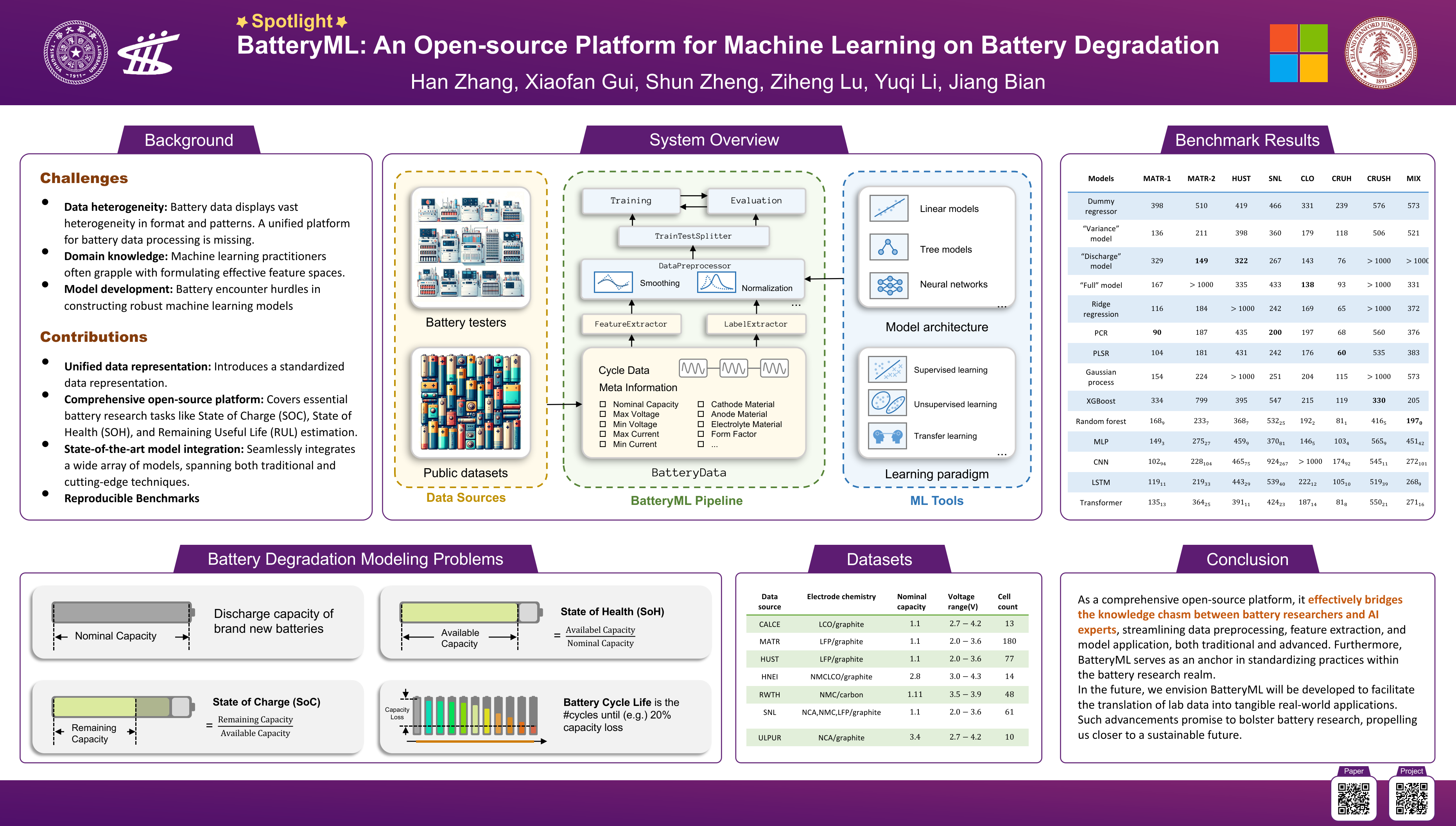 Battery degradation remains a pivotal concern in the energy storage domain, with machine learning emerging as a potent tool to drive forward insights and solutions. However, this intersection of electrochemical science and machine learning poses complex challenges. Machine learning experts often grapple with the intricacies of battery science, while battery researchers face hurdles in adapting intricate models tailored to specific datasets. Beyond this, a cohesive standard for battery degradation modeling, inclusive of data formats and evaluative benchmarks, is conspicuously absent. Recognizing these impediments, we present BatteryML—a one-step, all-encompass, and open-source platform designed to unify data preprocessing, feature extraction, and the implementation of both traditional and state-of-the-art models. This streamlined approach promises to enhance the practicality and efficiency of research applications. BatteryML seeks to fill this void, fostering an environment where experts from diverse specializations can collaboratively contribute, thus elevating the collective understanding and advancement of battery research.
