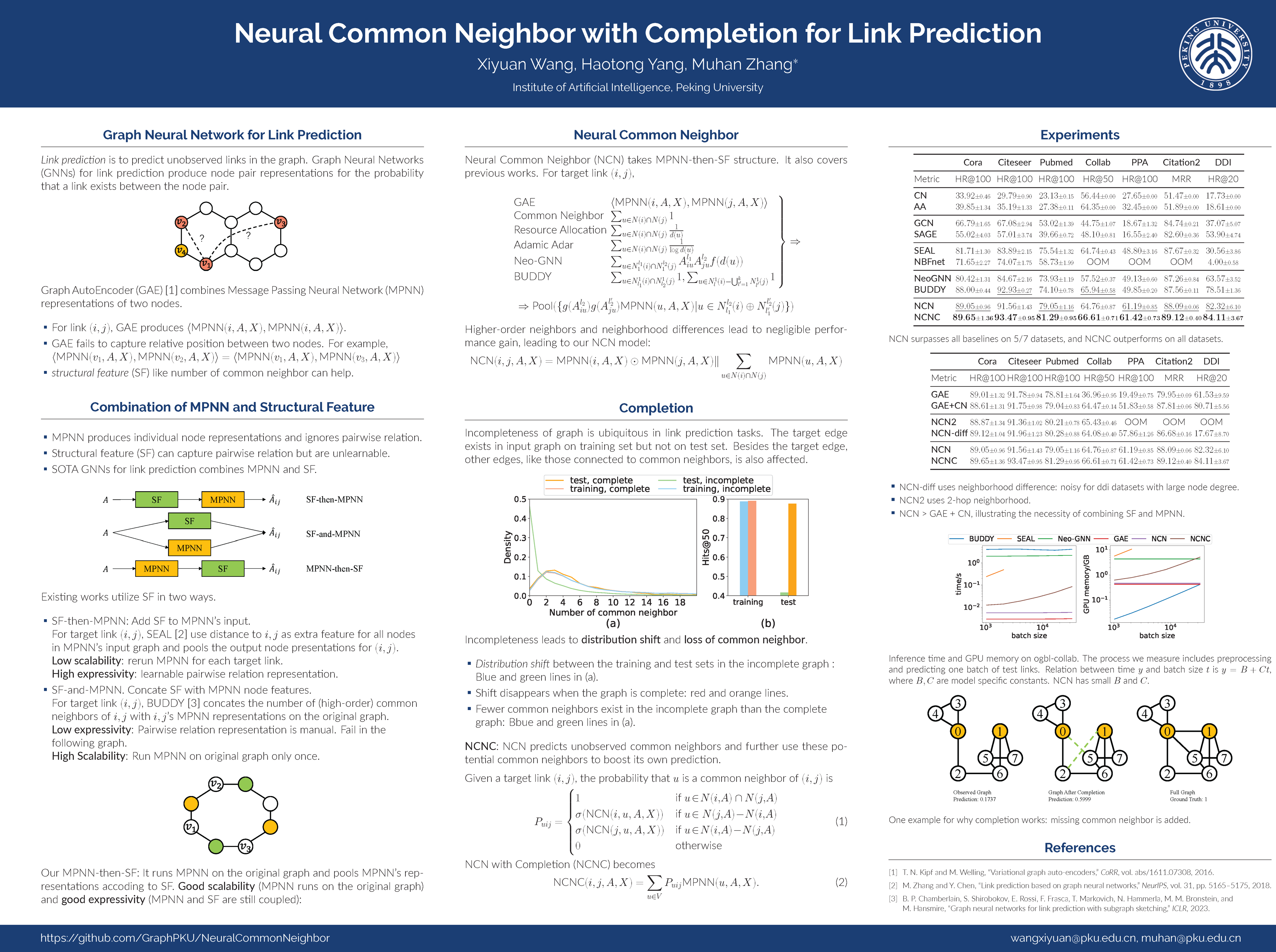 In this work, we propose a novel link prediction model and further boost it by studying graph incompleteness. First, We introduce MPNN-then-SF, an innovative architecture leveraging structural feature (SF) to guide MPNN's representation pooling, with its implementation, namely Neural Common Neighbor (NCN). NCN exhibits superior expressiveness and scalability compared with existing models, which can be classified into two categories: SF-then-MPNN, augmenting MPNN's input with SF, and SF-and-MPNN, decoupling SF and MPNN. Second, we investigate the impact of graph incompleteness---the phenomenon that some links are unobserved in the input graph---on SF, like the common neighbor. Through dataset visualization, we observe that incompleteness reduces common neighbors and induces distribution shifts, significantly affecting model performance. To address this issue, we propose to use a link prediction model to complete the common neighbor structure. Combining this method with NCN, we propose Neural Common Neighbor with Completion (NCNC). NCN and NCNC outperform recent strong baselines by large margins, and NCNC further surpasses state-of-the-art models in standard link prediction benchmarks.