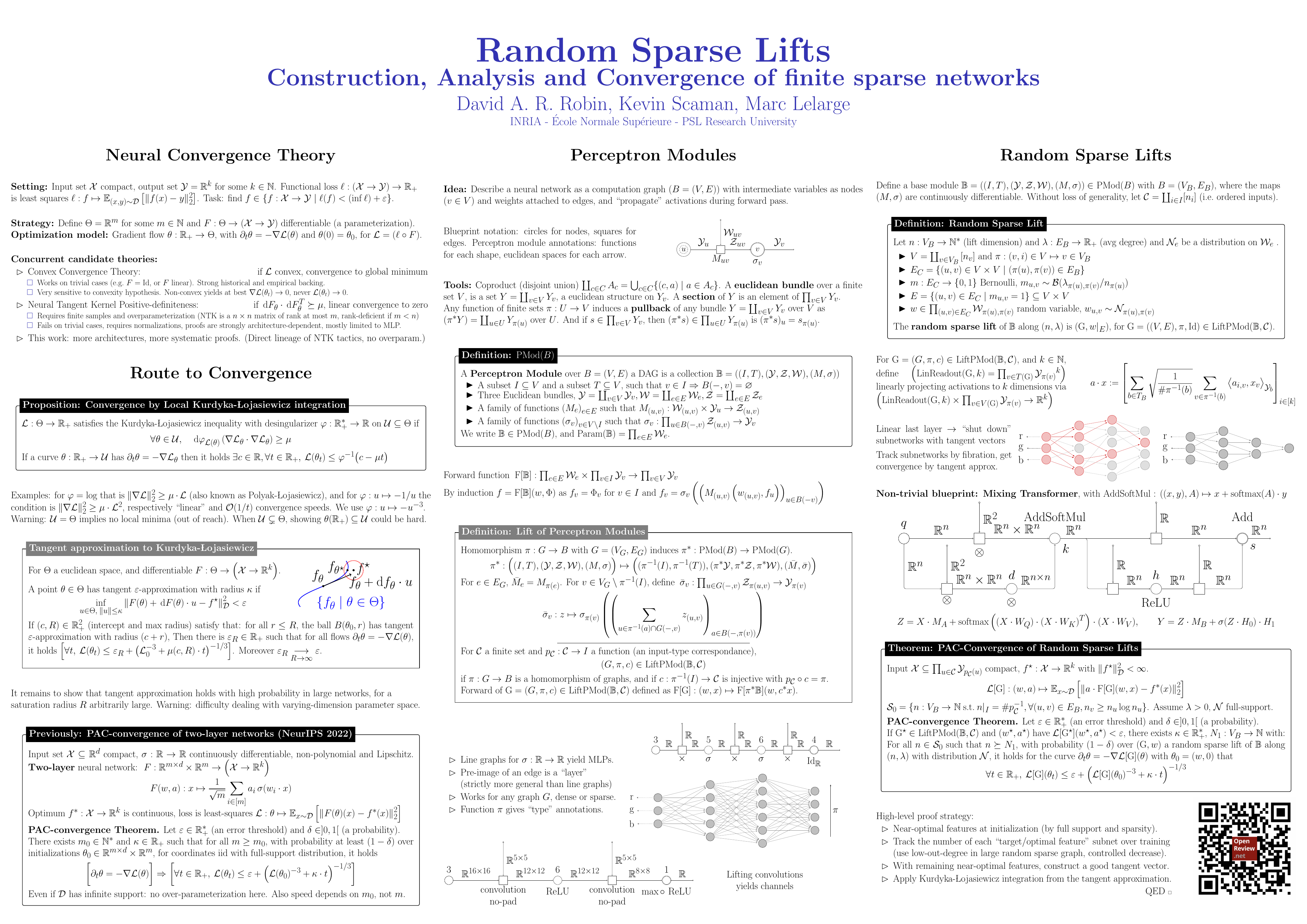 We present a framework to define a large class of neural networks for which, by construction, training by gradient flow provably reaches arbitrarily low loss when the number of parameters grows. Distinct from the fixed-space global optimality of non-convex optimization, this new form of convergence, and the techniques introduced to prove such convergence, pave the way for a usable deep learning convergence theory in the near future, without overparameterization assumptions relating the number of parameters and training samples. We define these architectures from a simple computation graph and a mechanism to lift it, thus increasing the number of parameters, generalizing the idea of increasing the widths of multi-layer perceptrons. We show that architectures similar to most common deep learning models are present in this class, obtained by sparsifying the weight tensors of usual architectures at initialization. Leveraging tools of algebraic topology and random graph theory, we use the computation graph’s geometry to propagate properties guaranteeing convergence to any precision for these large sparse models.