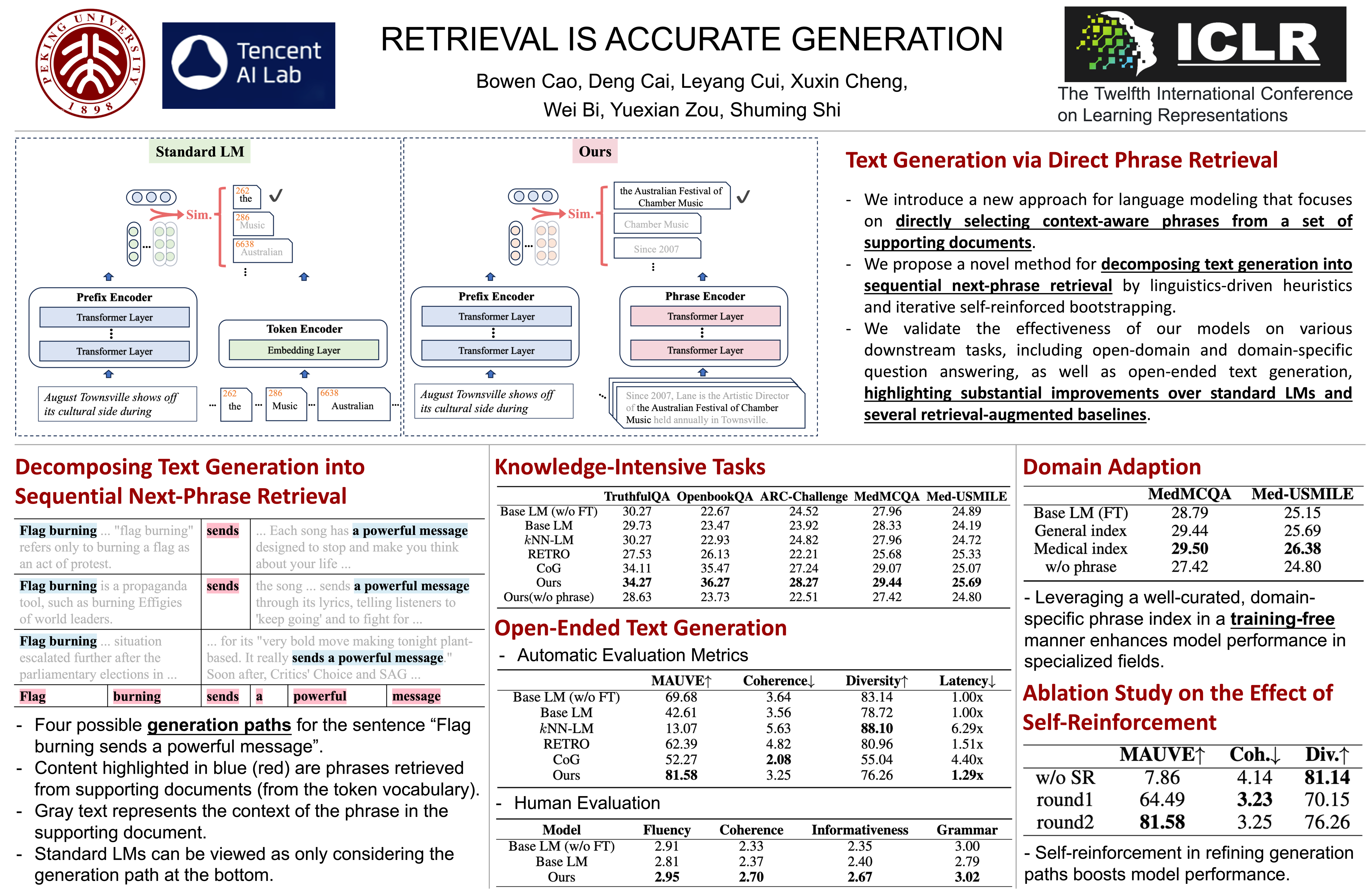 Standard language models generate text by selecting tokens from a fixed, finite, and standalone vocabulary. We introduce a novel method that selects context-aware phrases from a collection of supporting documents. One of the most significant challenges for this paradigm shift is determining the training oracles, because a string of text can be segmented in various ways and each segment can be retrieved from numerous possible documents. To address this, we propose to initialize the training oracles using linguistic heuristics and, more importantly, bootstrap the oracles through iterative self-reinforcement. Extensive experiments show that our model not only outperforms standard language models on a variety of knowledge-intensive tasks but also demonstrates improved generation quality in open-ended text generation. For instance, compared to the standard language model counterpart, our model raises the accuracy from 23.47% to 36.27% on OpenbookQA, and improves the MAUVE score from 42.61% to 81.58% in open-ended text generation. Remarkably, our model also achieves the best performance and the lowest latency among several retrieval-augmented baselines. In conclusion, we assert that retrieval is more accurate generation and hope that our work will encourage further research on this new paradigm shift.