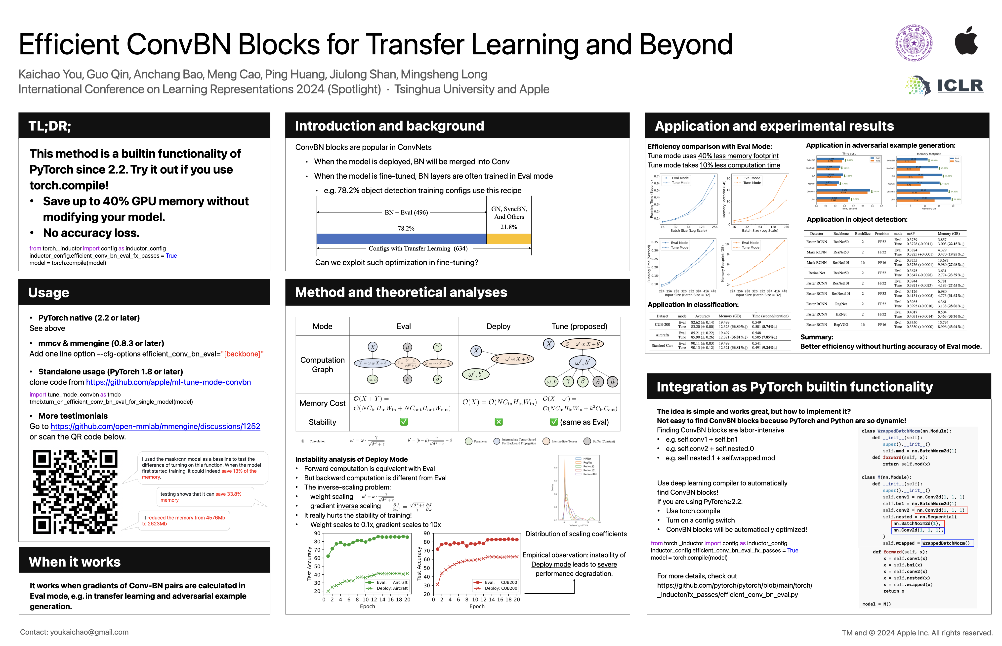 Convolution-BatchNorm (ConvBN) blocks are integral components in various computer vision tasks and other domains. A ConvBN block can operate in three modes: Train, Eval, and Deploy. While the Train mode is indispensable for training models from scratch, the Eval mode is suitable for transfer learning and beyond, and the Deploy mode is designed for the deployment of models. This paper focuses on the trade-off between stability and efficiency in ConvBN blocks: Deploy mode is efficient but suffers from training instability; Eval mode is widely used in transfer learning but lacks efficiency. To solve the dilemma, we theoretically reveal the reason behind the diminished training stability observed in the Deploy mode. Subsequently, we propose a novel Tune mode to bridge the gap between Eval mode and Deploy mode. The proposed Tune mode is as stable as Eval mode for transfer learning, and its computational efficiency closely matches that of the Deploy mode. Through extensive experiments in object detection, classification, and adversarial example generation across $5$ datasets and $12$ model architectures, we demonstrate that the proposed Tune mode retains the performance while significantly reducing GPU memory footprint and training time, thereby contributing efficient ConvBN blocks for transfer learning and beyond. Our method has been integrated into both PyTorch (general machine learning framework) and MMCV/MMEngine (computer vision framework). Practitioners just need one line of code to enjoy our efficient ConvBN blocks thanks to PyTorch's builtin machine learning compilers.
