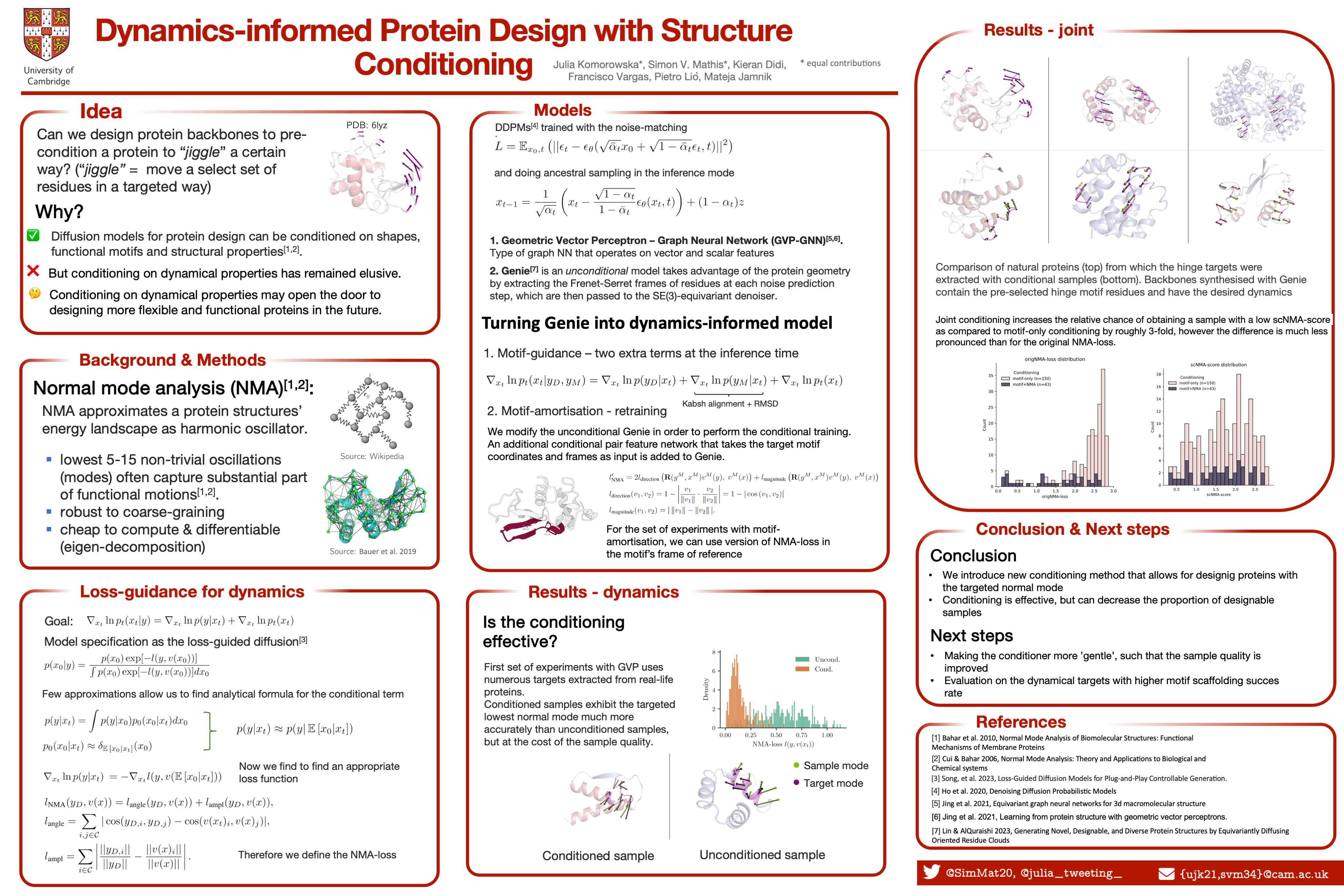 Current protein generative models are able to design novel backbones with desired shapes or functional motifs. However, despite the importance of a protein’s dynamical properties for its function, conditioning on dynamical properties remains elusive. We present a new approach to protein generative modeling by leveraging Normal Mode Analysis that enables us to capture dynamical properties too. We introduce a method for conditioning the diffusion probabilistic models on protein dynamics, specifically on the lowest non-trivial normal mode of oscillation. Our method, similar to the classifier guidance conditioning, formulates the sampling process as being driven by conditional and unconditional terms. However, unlike previous works, we approximate the conditional term with a simple analytical function rather than an external neural network, thus making the eigenvector calculations approachable. We present the corresponding SDE theory as a formal justification of our approach. We extend our framework to conditioning on structure and dynamics at the same time, enabling scaffolding of the dynamical motifs. We demonstrate the empirical effectiveness of our method by turning the open-source unconditional protein diffusion model Genie into the conditional model with no retraining. Generated proteins exhibit the desired dynamical and structural properties while still being biologically plausible. Our work represents a first step towards incorporating dynamical behaviour in protein design and may open the door to designing more flexible and functional proteins in the future.