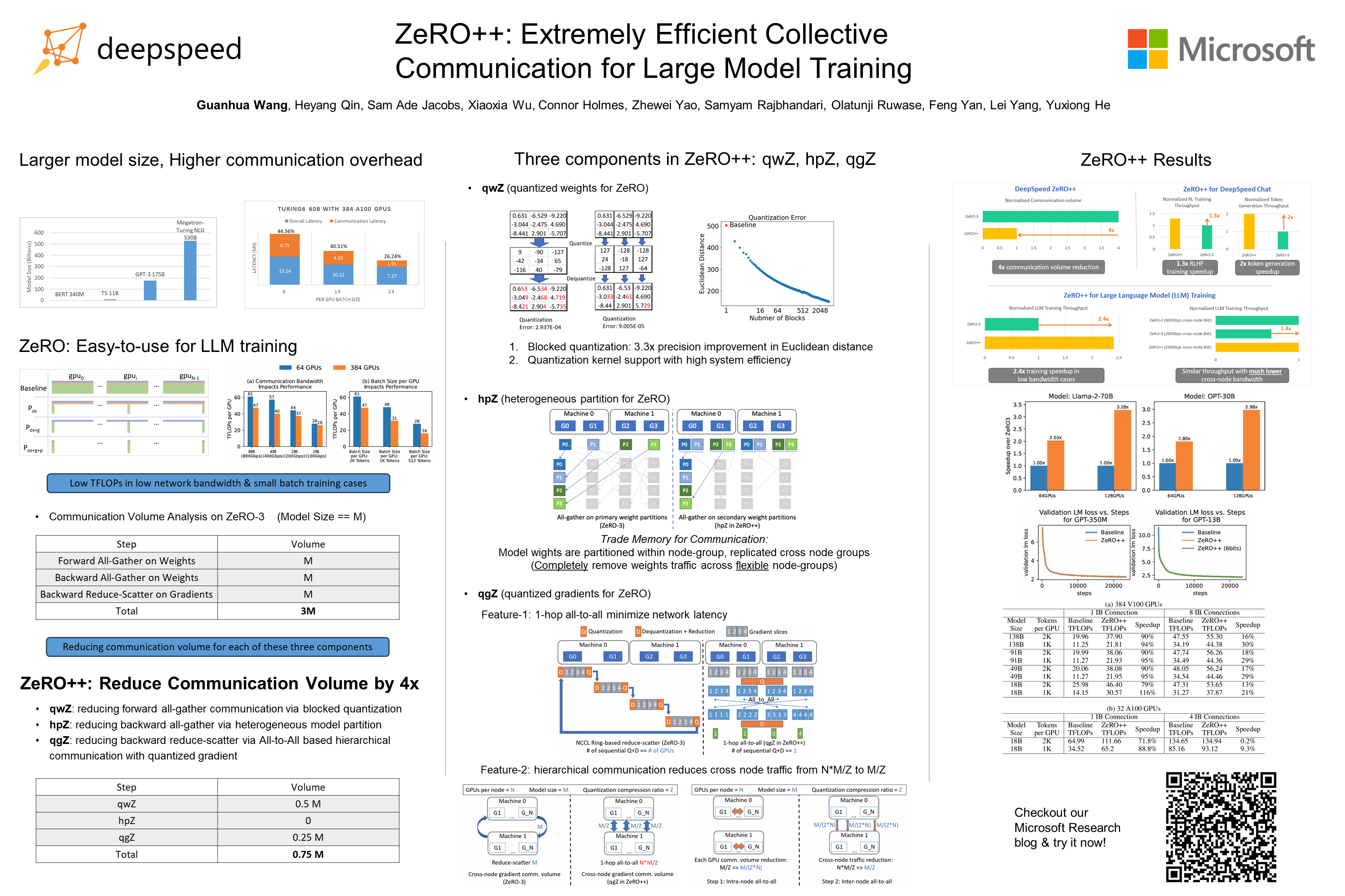 Zero Redundancy Optimizer (ZeRO) has been used to train a wide range of large language models on massive GPU clusters due to its ease of use, efficiency, and good scalability. However, when training on low-bandwidth clusters, and/or when small batch size per GPU is used, ZeRO’s effective throughput is limited due to communication overheads. To alleviate this limitation, this paper introduces ZeRO++ composing of three communication volume reduction techniques (lowprecision all-gather, data remapping, and low-precision gradient averaging) to significantly reduce the communication volume up to 4x that enables up to 2.16x better throughput at 384 GPU scale. Our results also show ZeRO++ can speedup the RLHF by 3.3x compared to vanilla ZeRO. To verify the convergence of ZeRO++, we test up to 13B model for pretraining with 8/6-bits all gather and up to 30B model for finetuning with 4/2-bits all gather, and demonstrate on-par accuracy as original ZeRO (aka standard training). As a byproduct, the model trained with ZeRO++ is naturally weight-quantized, which can be directly used for inference without post-training quantization or quantization-aware training.