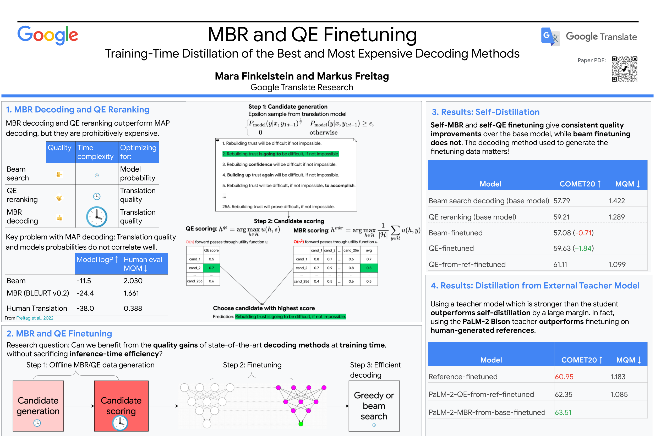Recent research in decoding methods for Natural Language Generation (NLG) tasks has shown that MAP decoding is not optimal, because model probabilities do not always align with human preferences. Stronger decoding methods, including Quality Estimation (QE) reranking and Minimum Bayes' Risk (MBR) decoding, have since been proposed to mitigate the model-perplexity-vs-quality mismatch. While these decoding methods achieve state-of-the-art performance, they are prohibitively expensive to compute. In this work, we propose MBR finetuning and QE finetuning, which distill the quality gains from these decoding methods at training time, while using an efficient decoding algorithm at inference time. Using the canonical NLG task of Neural Machine Translation (NMT), we show that even with self-training, these finetuning methods significantly outperform the base model. Moreover, when using an external LLM as a teacher model, these finetuning methods outperform finetuning on human-generated references. These findings suggest new ways to leverage monolingual data to achieve improvements in model quality that are on par with, or even exceed, improvements from human-curated data, while maintaining maximum efficiency during decoding.