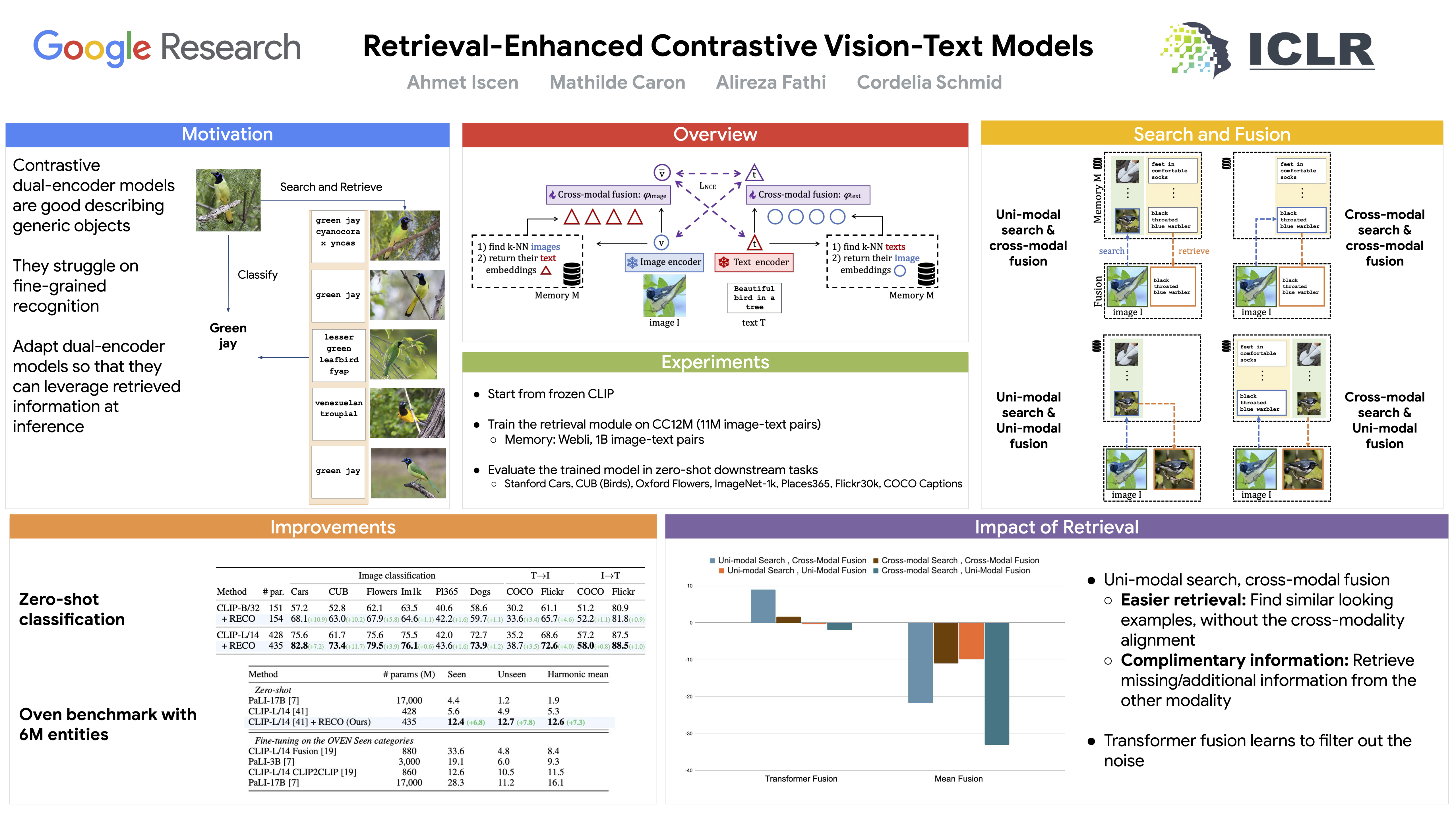 Contrastive image-text models such as CLIP form the building blocks of many state-of-the-art systems. While they excel at recognizing common generic concepts, they still struggle on fine-grained entities which are rare, or even absent from the pre-training dataset. Hence, a key ingredient to their success has been the use of large-scale curated pre-training data aiming at expanding the set of concepts that they can memorize during the pre-training stage. In this work, we explore an alternative to encoding fine-grained knowledge directly into the model's parameters: we instead train the model to retrieve this knowledge from an external memory. Specifically, we propose to equip existing vision-text models with the ability to refine their embedding with cross-modal retrieved information from a memory at inference time, which greatly improves their zero-shot predictions. Remarkably, we show that this can be done with a light-weight, single-layer, fusion transformer on top of a frozen CLIP. Our experiments validate that our retrieval-enhanced contrastive (RECO) training improves CLIP performance substantially on several challenging fine-grained tasks: for example +10.9 on Stanford Cars, +10.2 on CUB-2011 and +7.3 on the recent OVEN benchmark, where we even outperform the fine-tuned models on unseen classes.